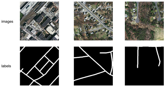 The Massachusetts road dataset contains 1171 images, each with a size of 1500 × 1500 pixels and a resolution of 1.2 m. The samples in this dataset were cropped into 10,854 images of size 512 × 512. Based on experimental requirements, the dataset was divided into a training set and a validation set, with 8684 images in the training set and 2170 images in the validation set. The example image from the Massachusetts Roads Dataset is shown in Figure 3.