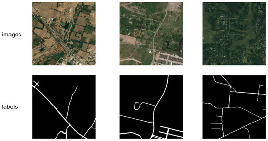 The DeepGlobe road dataset contains 6226 images, each sized 1024 × 1024 pixels with a resolution of 0.5 m. These images were cropped into 24,904 smaller images of 512 × 512 pixels. A total of 308 images were designated as the test set, while the remaining samples were split into a training set and a validation set in an approximate 4:1 ratio, with 19,676 images in the training set and 4920 in the validation set. The example image from the DeepGlobe dataset is shown in Figure 4.