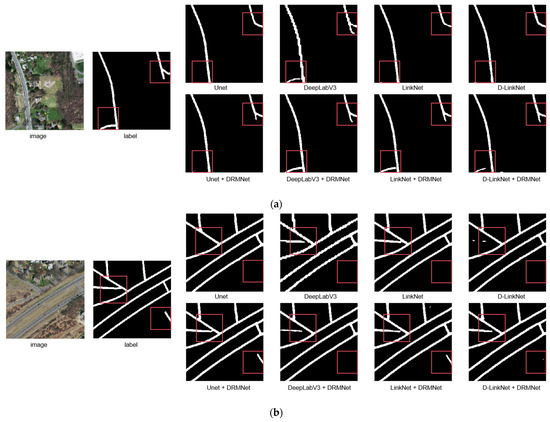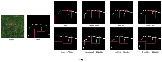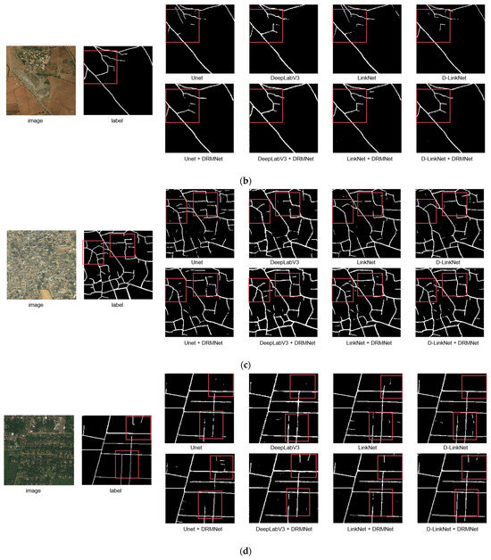 Regarding fragmentation in the extraction results, DeepLabv3, LinkNet, D-LinkNet, and UNet all display fragmentation, especially in Figure 5b,d. However, after processing with DRMNet, these fragmented sections are connected, effectively improving the continuity of the roads. In DeepLabV3’s results, the road integrity in each image is generally better than that of LinkNet, D-LinkNet, and UNet. However, its road boundaries are significantly jagged and uneven. After refinement with DRMNet, the jagged edges are noticeably smoothed, resulting in a more precise and smooth boundary.