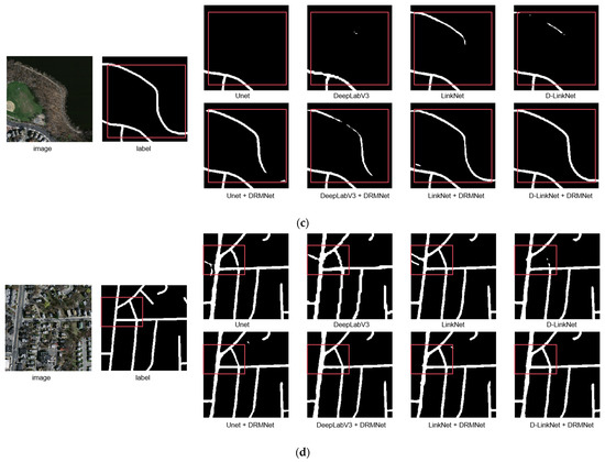 A comparison of road extraction results for the DRMNet model and other models on the Massachusetts dataset is shown in Figure 5. Overall, all these networks can extract the basic contours of road networks, but DRMNet produces more complete results than other networks. In Figure 5a,c, there are instances of missed extractions. LinkNet, D-LinkNet, and UNet exhibit varying degrees of omission, whereas DRMNet refinement achieves a more complete road extraction. In image c, for instance, there is a small road within the frame that LinkNet, D-LinkNet, and UNet fail to extract entirely, but DRMNet captures it accurately.