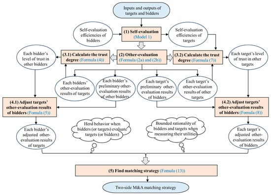 For efficiency evaluation, data envelopment analysis (DEA) [] is a commonly used method. DEA is a data-driven and non-parameter evaluation approach that can be used to evaluate the relative efficiencies of a group of homogeneous decision-making units (DMUs). Also, DEA possesses many advantages compared with other methods such as analytic hierarchy process [] and stochastic frontier analysis []. First, DEA can comprehensively evaluate DMUs containing multiple indicators, including inputs and outputs. Second, DEA is a non-parametric evaluation method that does not require pre-setting the form of the production function. Third, DEA does not require experts to subjectively score the evaluation indicators. It can objectively give the values of the indicator weights by running the mathematical formula. Based on these advantages, researchers make significant theoretical advances, proposing various improved models based on the classic CCR and BCC models. Among these models, the cross-efficiency model [] can provide mutual evaluation because the cross efficiency is integrated by the self-evaluation and other-evaluation results. Based on this characteristic of cross efficiency, it is widely used to evaluate DMUs’ efficiencies, such as the electricity generation and transmission system [], banks [], basketball games [], and firms []. Therefore, DEA is a feasible method can be used to evaluate the performance of M&A activities, and the concept of cross efficiency in DEA can be used for mutual evaluation between bidders and targets. Nevertheless, the existing studies on cross efficiency are not entirely applicable to the mutual evaluation of bidders and targets in the M&A activity. Specifically, for the other-evaluation in previous studies on cross efficiency, the herd behavior of decision makers is mostly ignored. In other words, previous studies assume decision makers are completely confident, so each DMU is not influenced by other DMUs’ other-evaluation results when evaluating other DMUs. However, in reality, decision makers often lack confidence in their opinions and are easily influenced by the opinions of others, especially the opinions of the those they trust [,,,]. Therefore, it is necessary to construct a novel mutual evaluation method considering the herd behavior, then use it to achieve the two-side M&A matching.