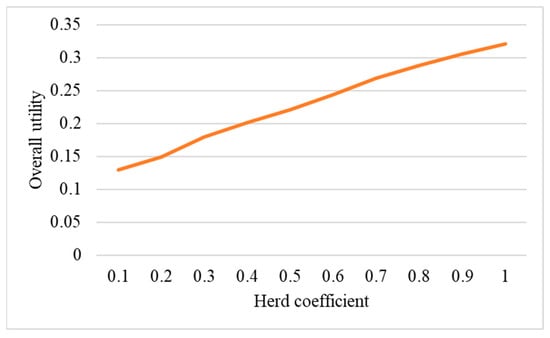 First, we present the adjusted other-evaluation results under three representative values of the herd coefficient; they are , , and , as shown in Appendix A. In Section 4.1, represents the situation where targets and bidders are relatively high self-confidence while still being somewhat influenced by trusted individuals. In contrast, reflects the opposite case, where the targets and bidders show low self-confidence and place greater reliance on the opinions of those they trust. Furthermore, indicates a relatively neutral state, and signifies that the targets and bidders are entirely confident. The situation with is equal to the situation without considering the herd behavior in the mutual evaluation. Second, with the above representative values of the herd coefficient, we obtain different matching results, which are presented in Appendix B. At the same time, we report the overall utility of these matching results, which are the optimal values of Model (13). The following figure (i.e., Figure 2) reveals that the higher the herd coefficient, the greater the overall utility. Such a result tells us that during M&A, mutual evaluations considering others’ opinions can enhance overall satisfaction with the restructuring process.