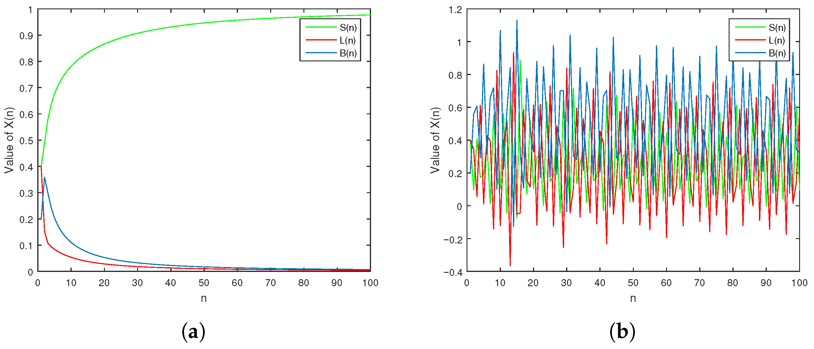 . The 2D projections onto the S–L, S–B, and L–B planes provide a clearer view of the attractor structures. We observe that as the fractional order increases, the attractors become more complex and denser, indicating stronger chaotic dynamics. These trajectories illustrate rich dynamical behaviour and highlight the system’s sensitivity to variations in the fractional order. This characteristic is a distinctive feature of discrete fractional-order models, emphasizing their ability to capture irregular and unpredictable propagation patterns in computer virus dynamics.