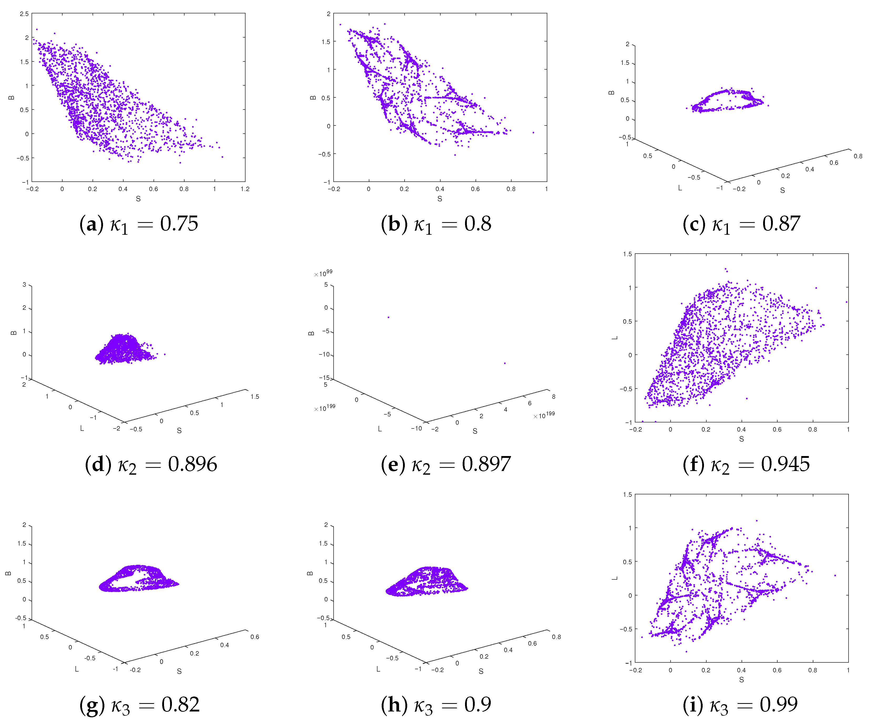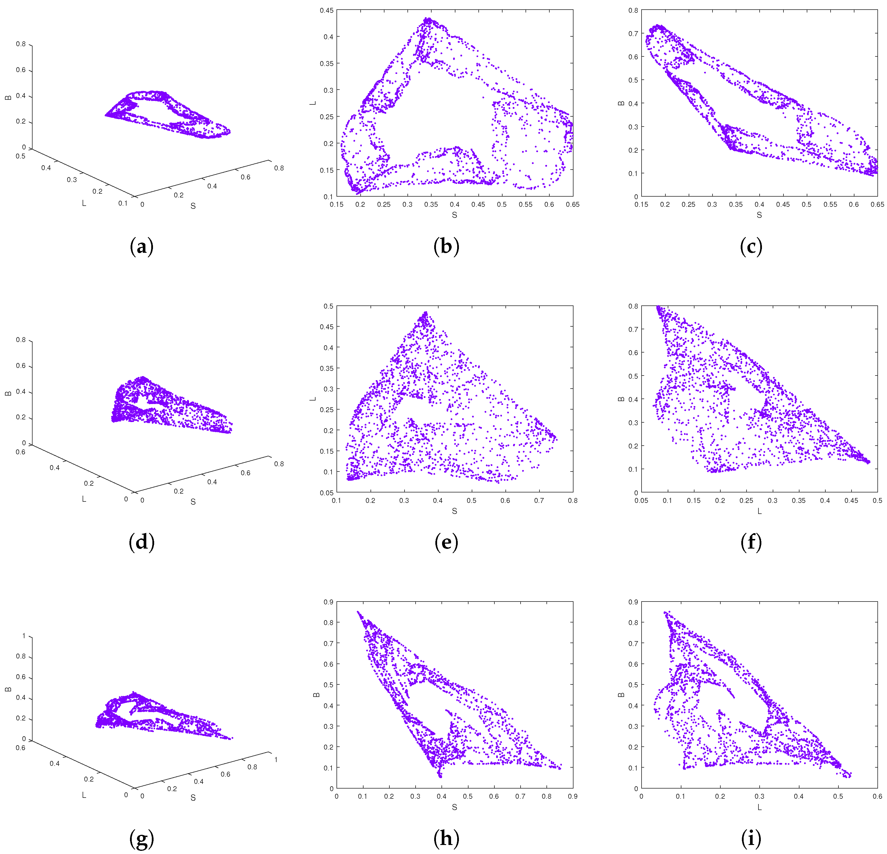 , together with their 2D projections onto the S–L, S–B, and L–B planes. These visualizations illustrate the system’s attractors and complement the bifurcation diagrams and MLE plots by revealing the geometric structure of the dynamics.