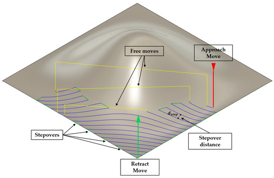 In practical machining, several technological motions must be considered, each executed at different speeds. First, there is the tool approach motion toward the workpiece before machining begins, and the tool retraction after machining ends, both performed at the machining speed assigned to the specific region or to the entire workpiece. The rapid free motion refers to tool movement through free space, without material removal, when transitioning between different regions of the workpiece; this is usually carried out at higher speeds to minimize non-productive time. In our case the speed was set to 150 mm/s. The stepover speed defines the tool speed when moving between adjacent toolpaths or stepovers, which is typically slower, set at 20 mm/s. In this study, the stepover distance between successive passes was set in the range of 0.1 mm to 2 mm, corresponding to values typically employed in high-precision surface finishing operations.