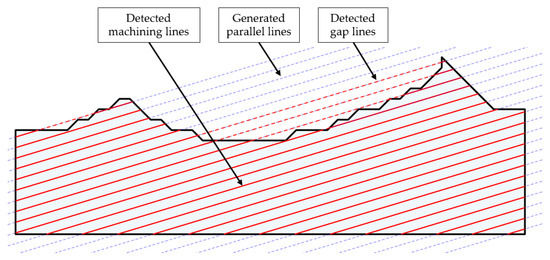 To obtain the region width, lengths of individual machining paths, and the number of passes , the polyshape and intersect functions in the MATLAB 2023b environment were used, which enabled calculation of the intersections between the projected machining lines and region boundaries. The procedure includes (i) generating parallel lines (paths) in the optimal machining direction at uniform spacing , (ii) calculating the intersections of these paths with the machining region, defined as a polygonal region, (iii) determining the length of each machining path segment, (iv) estimating the number of stepovers, where each path segment represents one machining stepover. Figure 2 shows the generated parallel lines in the optimal machining direction with blue dashed lines. These extend across the entire region to define potential machining paths. The red solid lines indicate the machining lines detected within the region, resulting from the intersection of the generated lines with the region boundaries. The red dashed lines represent identified gaps and the black line represents the region boundary, which constrains the feasible machining area. This process represents the successful detection and estimation of machining lines/paths and the calculation of their lengths.