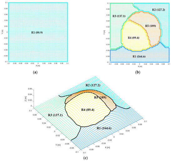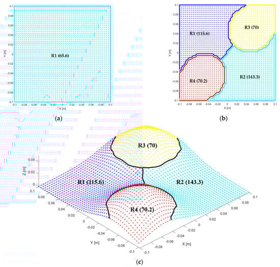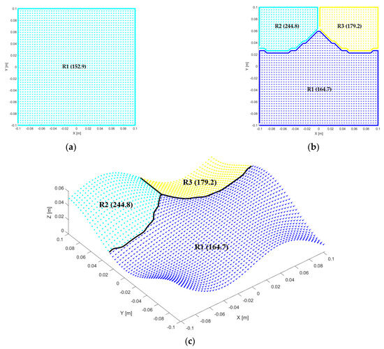 To summarize, the clustering procedure is based on the input parameter , which defines the desired number of clusters for the K-means clustering algorithm. This initial clustering results in a set of clusters , with the actual number of clusters denoted as . Since a single cluster may consist of several disconnected sub-clusters, these sub-clusters are analysed and merged into the final machining regions , whose number is denoted as . This process can be expressed as: . The values of and do not necessarily coincide with the input parameter . Differences may occur, due to the spatial disconnection of individual clusters and the merging of small regions into larger ones for more practical machining regions [20].