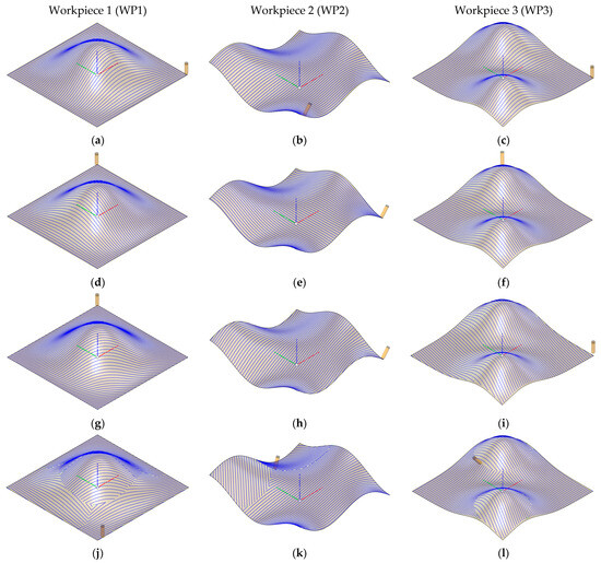 Figure 7. Comparison of the different machining paths for three workpieces, WP1 (left column), WP2 (middle column), and WP3 (right column), in their optimal placements: (a–c) machining in the X-direction, (d–f) machining in the Y-direction, (g–i) machining in an optimal single-direction, (j–l) machining with region-based optimal directions. - Single-direction optimal machining: In this case, the machining direction was determined based on the MTI calculated for the entire workpiece (Figure 7g–i). The chosen direction represents the globally most efficient direction, minimizing the overall machining time.