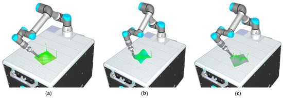 Matrix maps a 2D linear velocity vector in the Cartesian plane to a 3D velocity vector in the Cartesian space, whereas maps a 2D linear velocity vector in the Cartesian plane to a 3D angular velocity in the Cartesian space. By constraining the robot motion to remain on the workpiece surface and enforcing continuous alignment of the tool with the surface normals, the augmented inverse Jacobian projects the full six-dimensional space of end-effector velocities (17) onto the two-dimensional tangent plane. This projection reduces the manipulability ellipsoid to an in-plane ellipse, eliminating the unit inconsistency that arises when mixing linear and angular velocity components and ensuring that all feasible tool velocities are expressed consistently within the tangent plane. More detailed derivations and explanations can be found in [18].