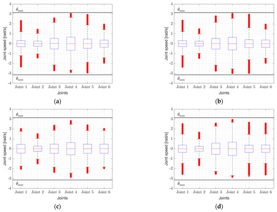 It can be seen that the joint speeds remained close to the upper allowable limit in all cases, but never exceeded it. This confirms that the proposed method exploits the robot’s maximum machining linear speed capabilities effectively, while respecting the maximum feasible joint speeds accurately.