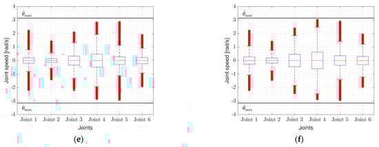 Previous validations showed that discrepancies exist between the linear speeds predicted by the VVF model and the actual speeds along real machining paths. This deviation may reflect local exceedances of the joint speed limits. Therefore, in practical implementations, the final path speeds were determined with a safety factor—a 10% reduction relative to the calculated maximum speed was applied in this study. Figure 9 presents boxplots of the joint speeds for individual robot joints under different machining strategies with a stepover distance of 1 mm. The left column shows the results for optimal single-direction machining, while the right column shows those for region-based machining. The subfigures correspond to different workpieces: Figure 9a,b WP1, Figure 9c,d WP2, and Figure 9e,f WP3.