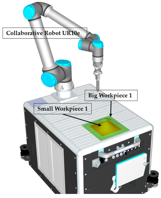 In the previous experiments all the workpieces were considered at their base dimensions of 200 × 200 mm (L × W), using the collaborative robot UR5e (Universal Robots, Odense, Denmark). However, in certain scenarios, a workpiece may include relatively small machining regions where high machining speeds are feasible. In such cases, the effects of robot acceleration and deceleration become more pronounced, which can lead to relatively greater time losses and reduced overall efficiency. To investigate the influence of workpiece size on time efficiency, an additional experiment was conducted in which the original workpieces were scaled up proportionally by 50%, resulting in final dimensions of 300 × 300 mm with proportional scaling applied to the height as well. For this experiment, the collaborative robot UR10e was used, as it provides a larger reach and is thus capable of handling bigger workpieces. The UR10e robot, together with both the small and enlarged versions of WP1 mounted on the platform, is shown in Figure 10. Unlike the previous experiments performed on the physical UR5e robot, the machining times for the enlarged workpieces were obtained exclusively in the URSim simulation environment, because a physical UR10e robot was not available. Nevertheless, in all the earlier UR5e experiments, the simulator was verified to yield machining times consistent with the real robot execution, thereby ensuring the reliability of the results presented here.