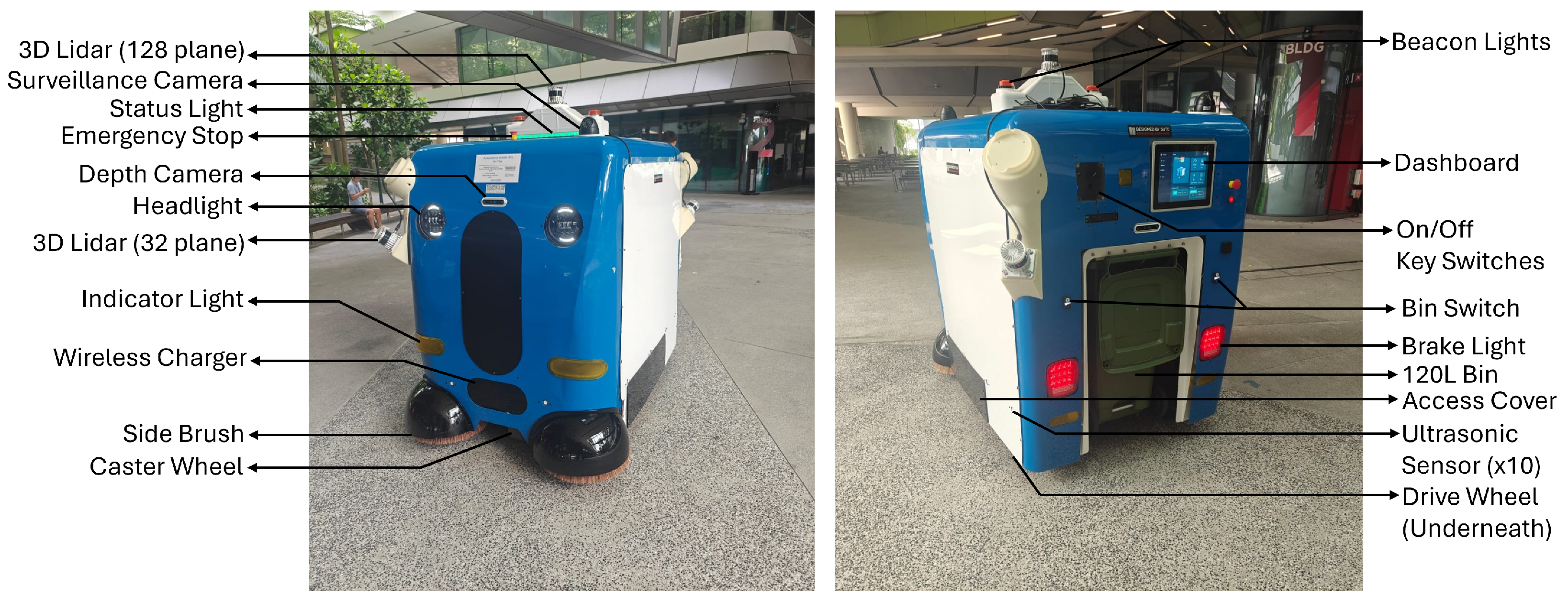 - Enway GmbH. Autonomous Bucher CityCat V20e Sweeper Approved for Public-Road Use in Singapore. 2021. Press Release, 12 July 2021. Available online: https://enway.ai (accessed on 15 May 2025).