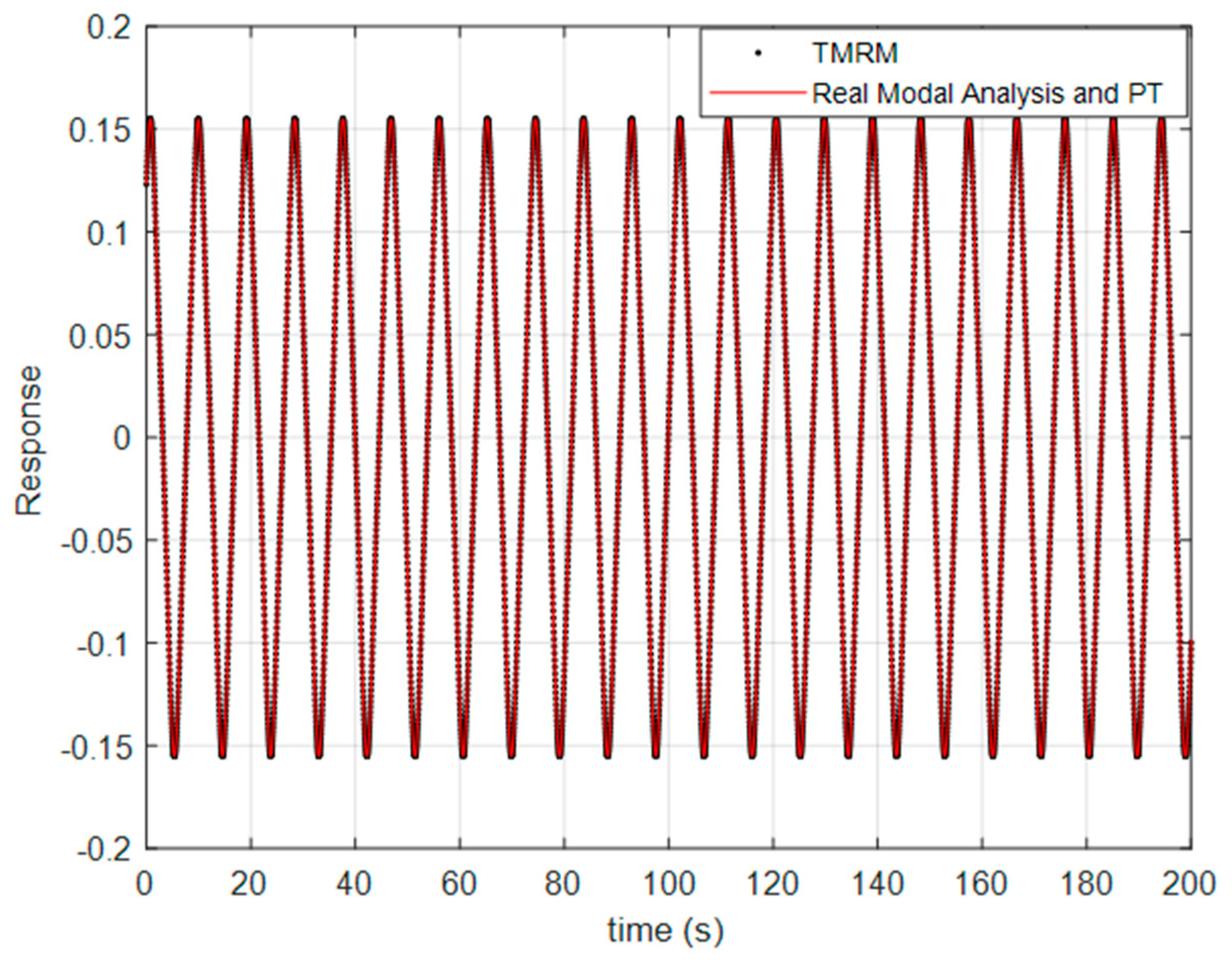 Table 1, the displacement-time diagrams calculated by the real modal analysis with the P-T method and those by the TMRM are nearly identical, with minimal numerical differences in the solutions. For ease of analysis,