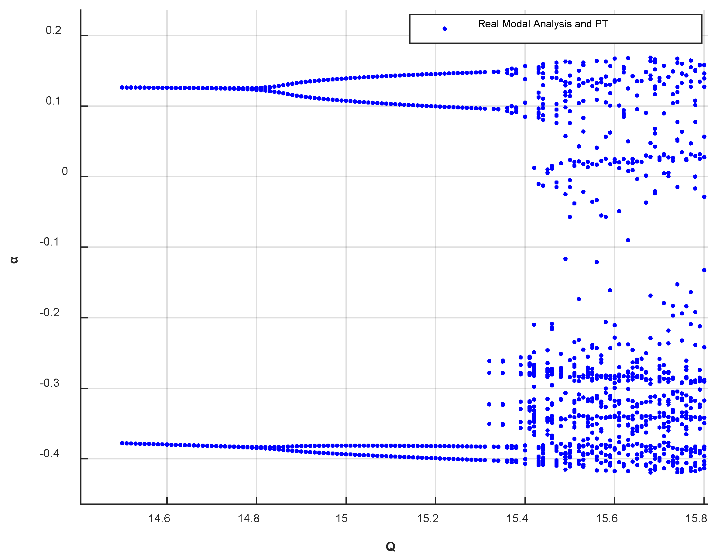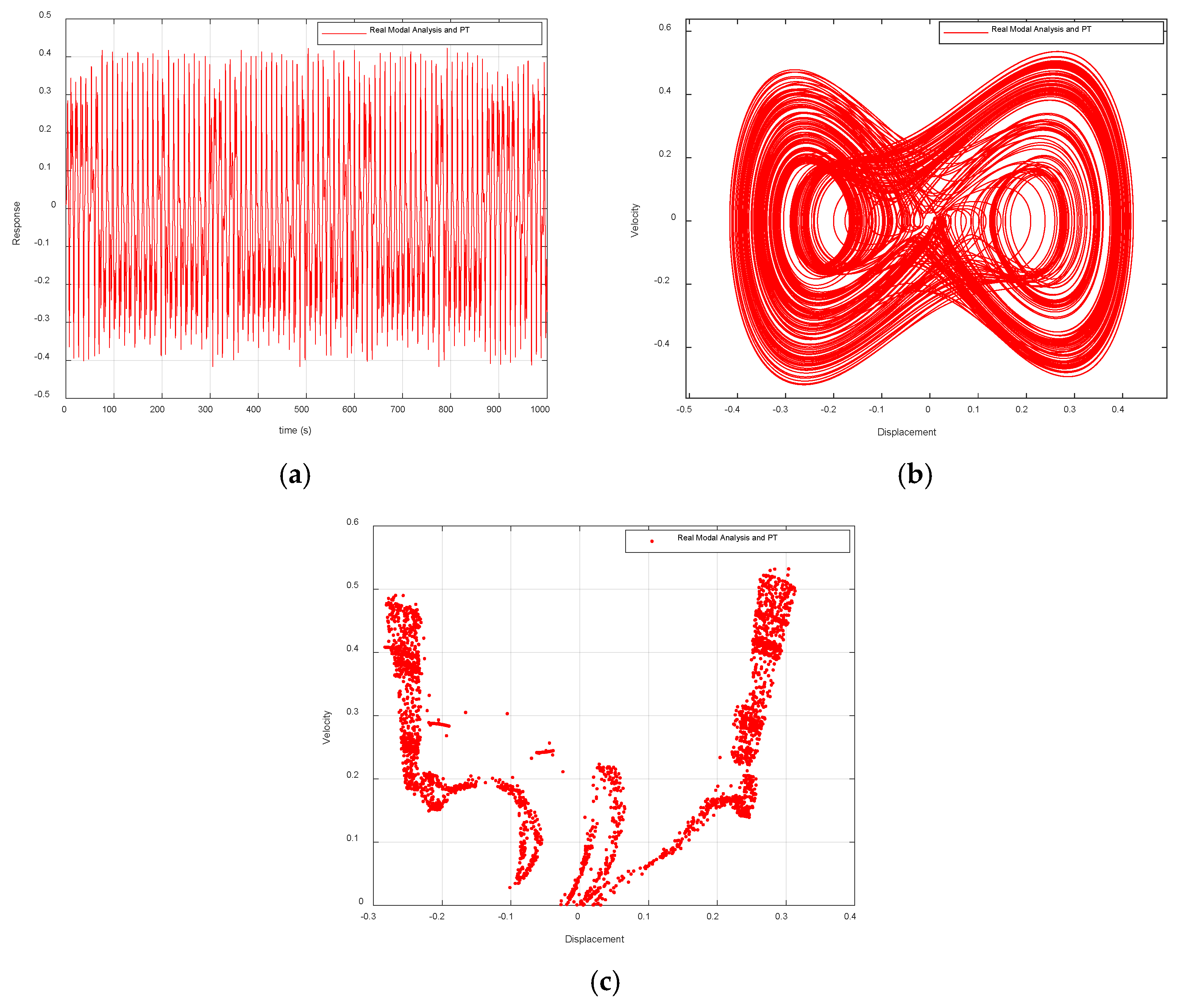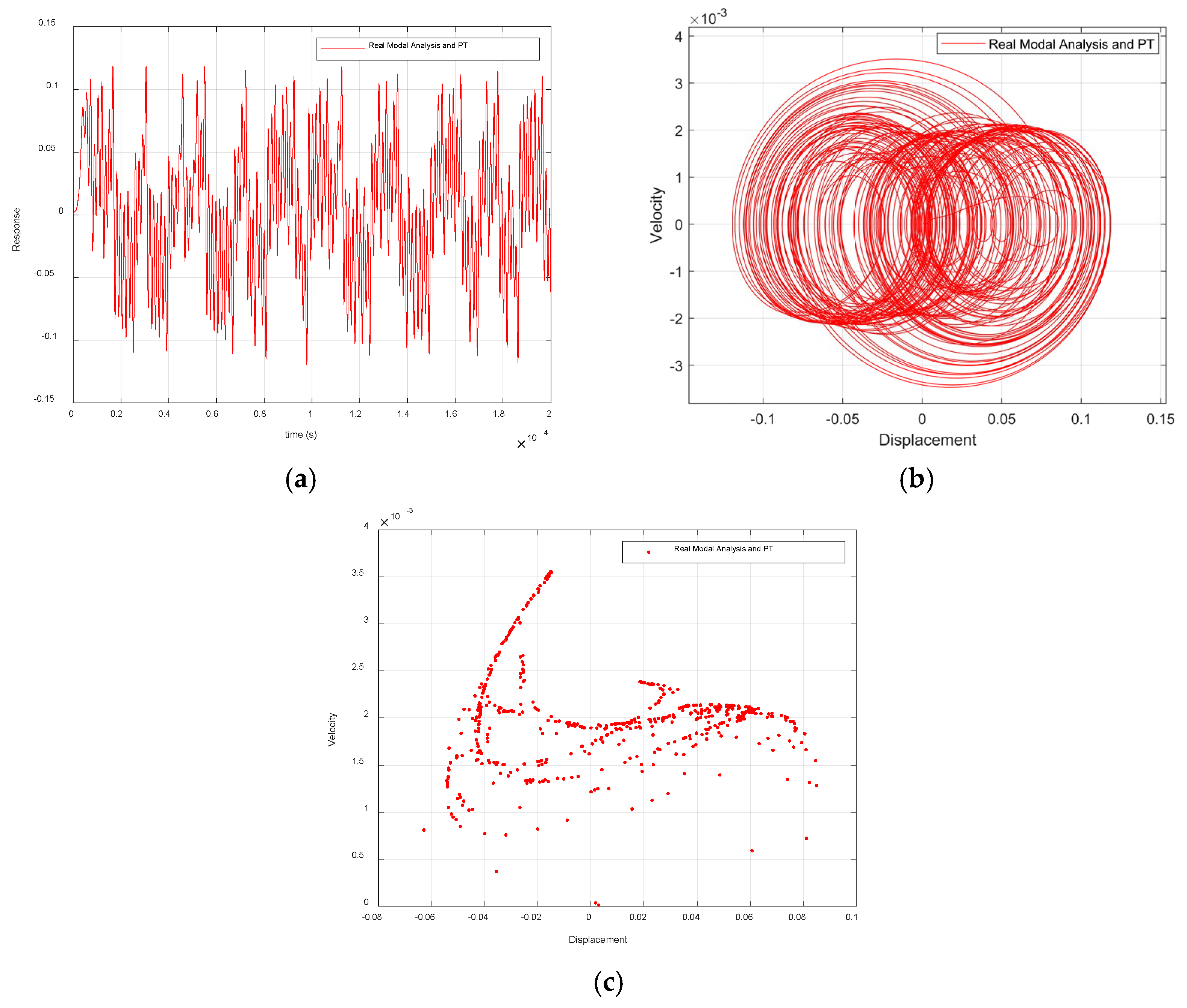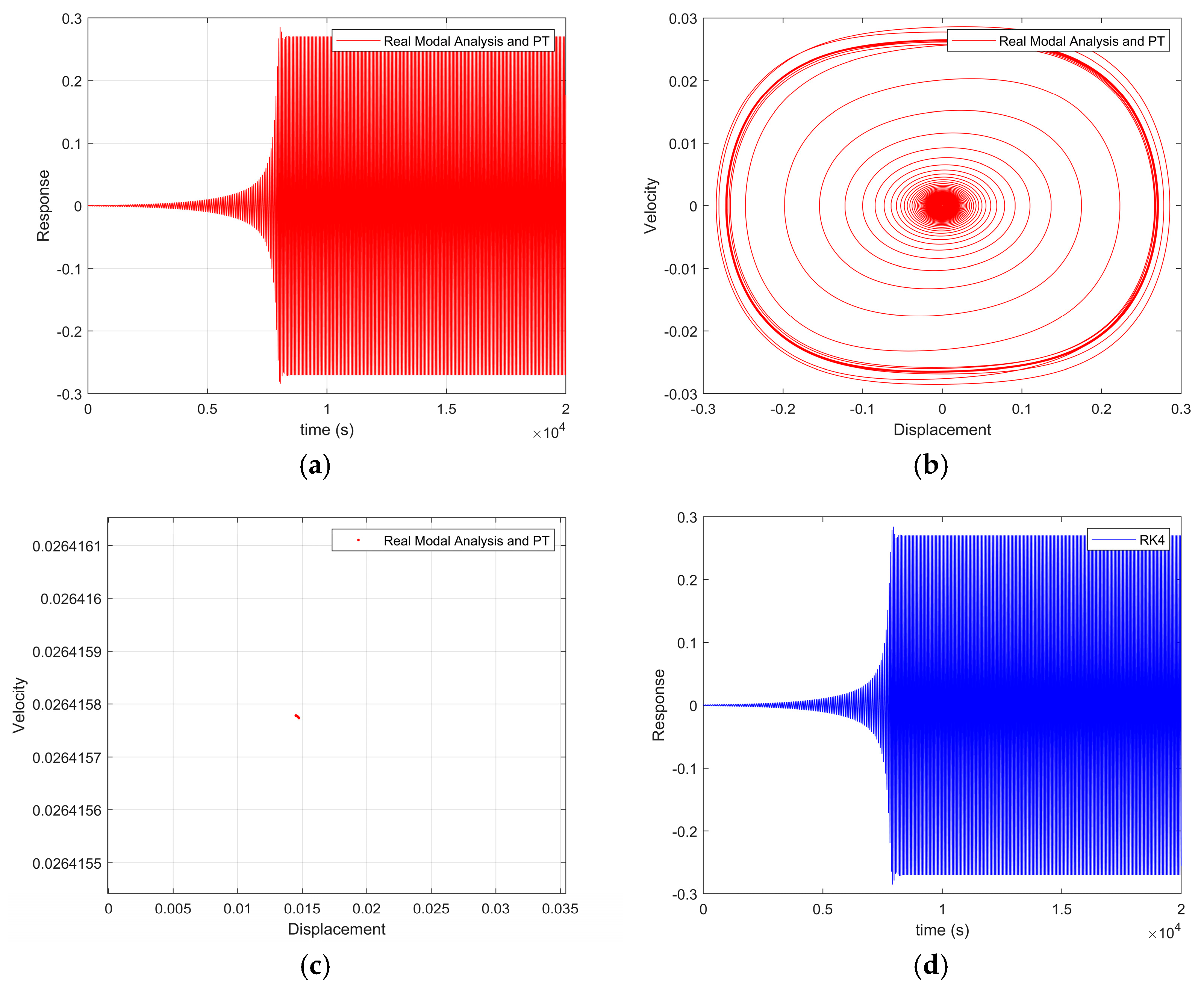 Figure 11d. The results indicate the system ultimately stabilizes, completely consistent with the results obtained by this paper’s real modal analysis combined with the P-T method. This correction reveals the limitations of short-term numerical simulation in nonlinear systems and emphasizes that fully extending the observation time plays a decisive role in accurately identifying the steady-state behavior of the system.