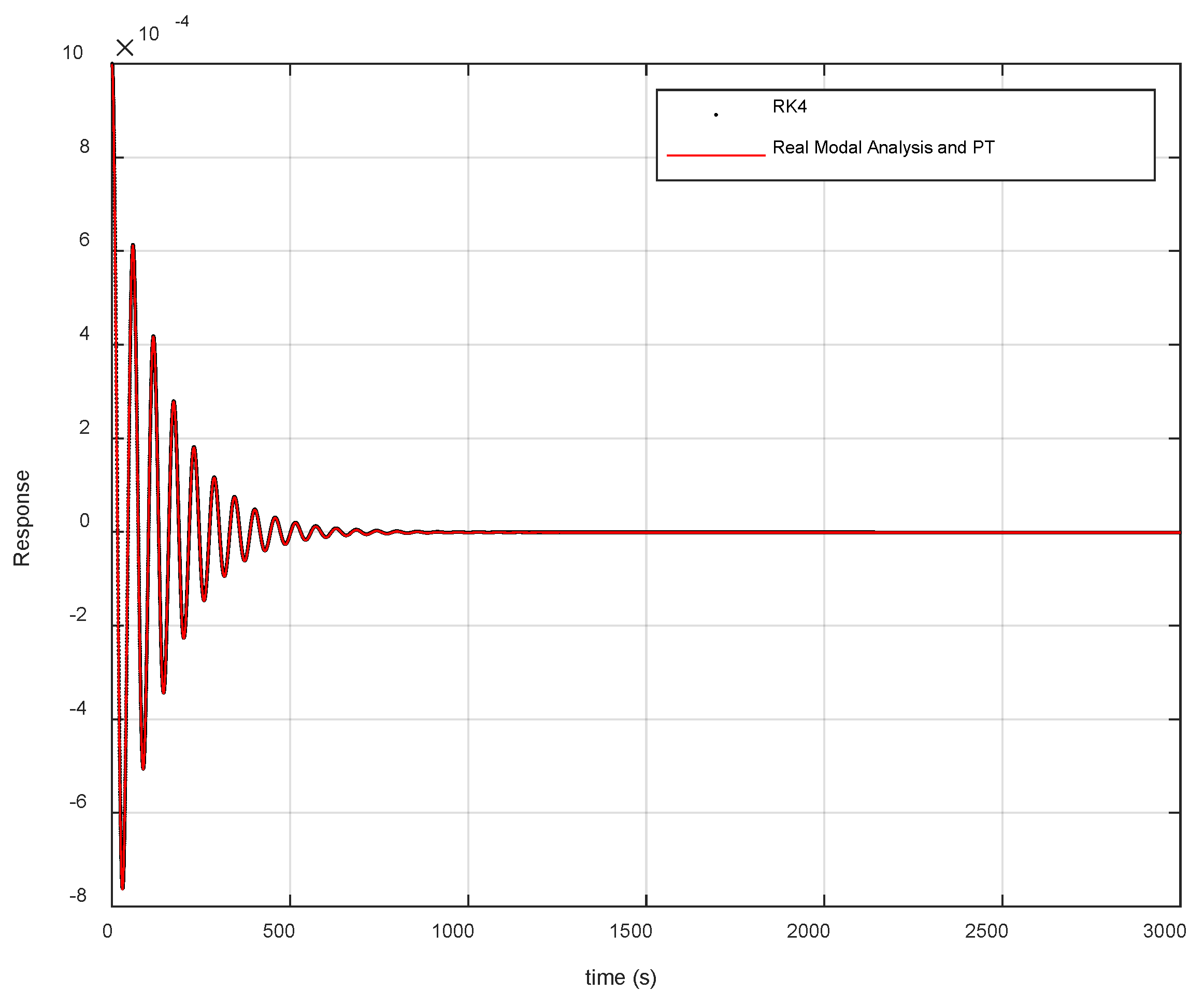 Table 3, the time history graphs calculated by combining the real modal analysis with the P-T method and the RK4 method show a high degree of consistency and almost complete overlap. For the convenience of subsequent in-depth analysis, the relevant error data are listed in