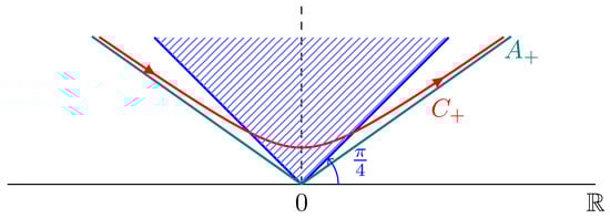 The curve of integration, , can be chosen to be any simply connected open (and infinite) curve of the upper half plane with two (linear) asymptotes that are defined by ; for an example, see Figure 2. This is useful if one would wish to avoid the computation of any pole contribution occurring in the process described in the remaining part of this section.