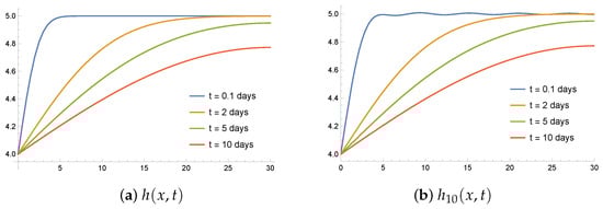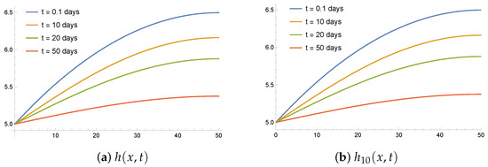 In Figure 4 we present the solution given by (4) where defined by (12) solves (9a)–(9d) with initial function the quadratic function (13) for and days. The expected physically meaningful behavior is clearly observed.