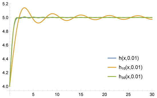 In Figure 5 we present the integral solution (19) and the series solution (22) with for m. We observe that more terms in the series are required to accurately capture the behavior at short times, whereas for larger times, the series and integral solutions match almost perfectly. This happens because the initial and boundary conditions are not compatible, resulting in a non-smooth solution at the boundary as