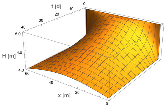 We set the soil parameters m/day and and the heights m and m. The mean value of h is usually approximated by m.