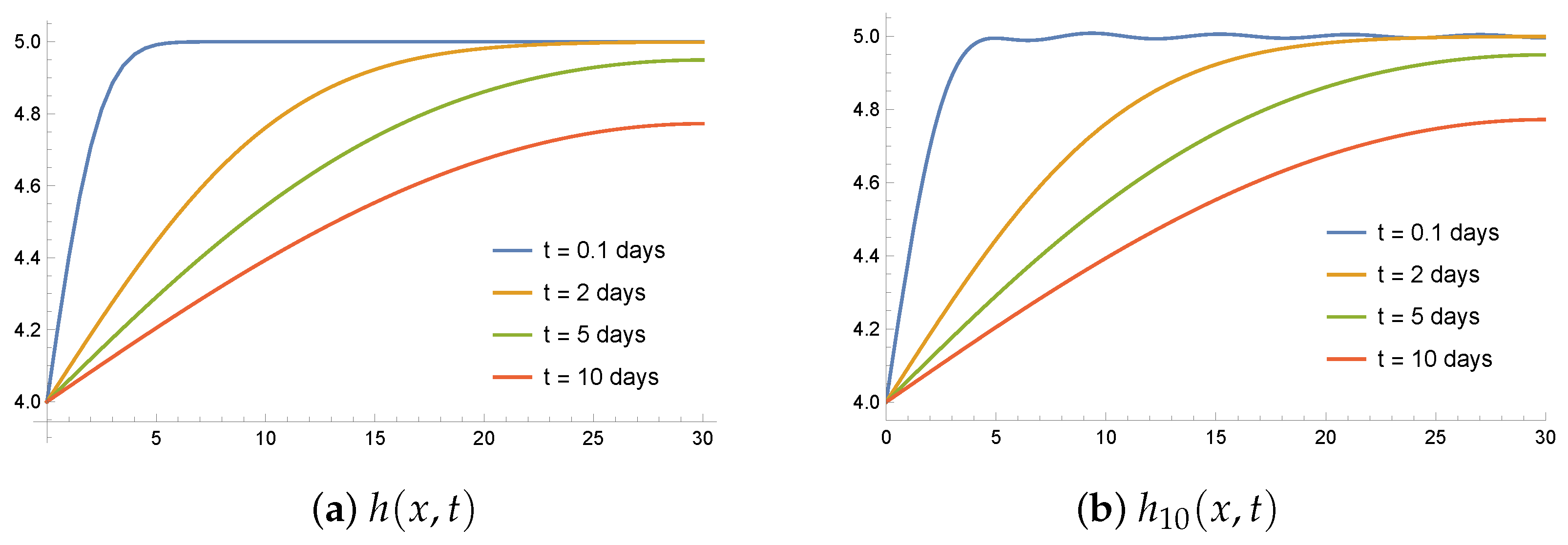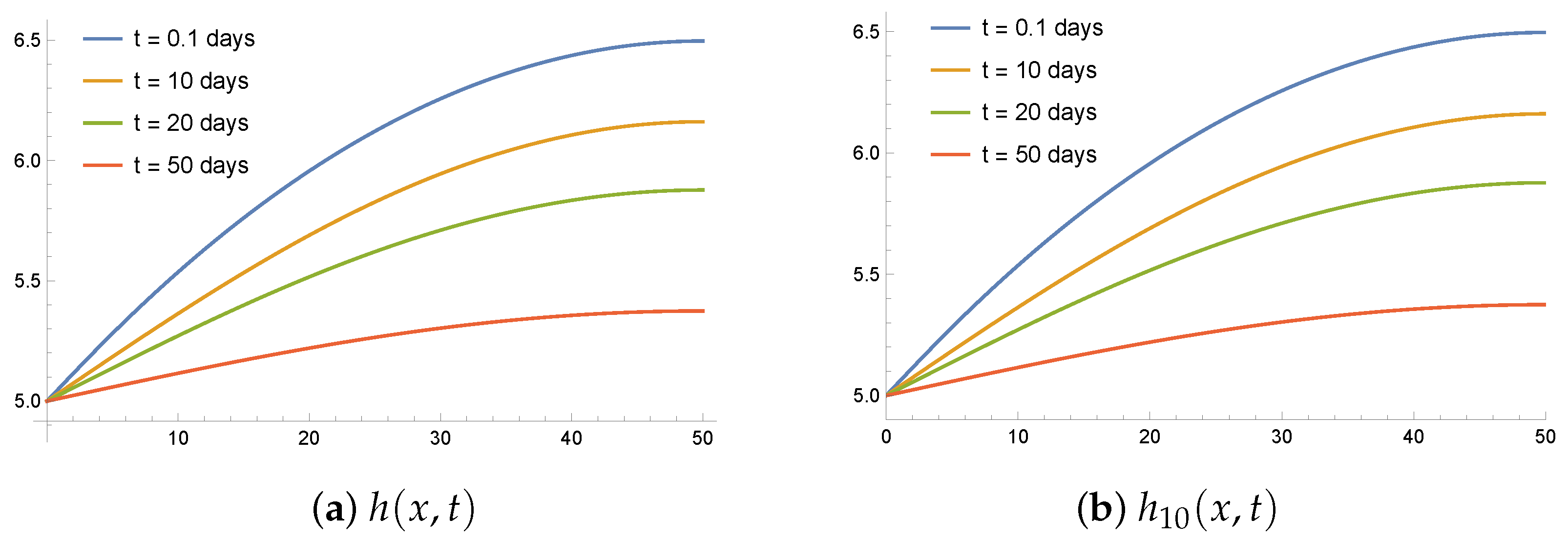 Example 2. Using separation of variables, the solution for constant initial condition is given by We set the soil parameters m/day and and the heights m and m. The mean value of h is given by m.