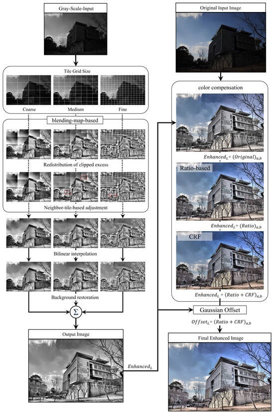 The generated tilewise LUTs are smoothly connected at the pixel level via bilinear interpolation. After interpolation, the background is restored by referencing the original pixel values to recover shadow regions degraded by excessive tone compression, enhancing visual stability and structural preservation. The multiscale LUTs are averaged across scales, reflecting the detail enhancement effect of small tiles and the block-artifact suppression effect of large tiles. In the background restoration stage, regions distorted by excessive contrast adjustment are normalized based on the original image and corrected in consideration of the harmony with the surrounding gradation distributions, improving the overall naturalness of the image. In addition, a CRF based on the original chromatic components and ratio-based chroma compensation is applied to mitigate color distortion caused by luminance correction.