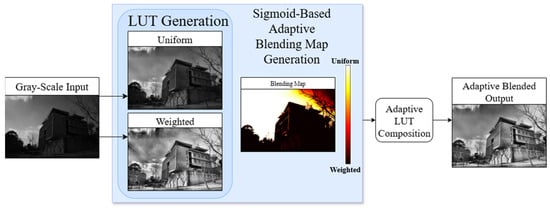 After the blending map adjustment is completed, an LUT is generated for each tile according to its blending weight, and the final pixel values are determined based on this LUT. This step integrates the histogram equalization results from the uniform and weighted redistributions according to the blending weights derived from the blending map. Furthermore, an interpolation procedure is incorporated to alleviate gradation discontinuities that may arise along the tile boundaries.