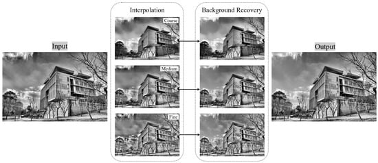 The image-contrast enhancement preprocessing technique is critical for securing visibility in dark regions and restoring fine details under poor illumination. Global histogram equalization (GHE) improves the overall contrast by redistributing the global pixel distribution according to the cumulative distribution function [,]. However, when different brightness distributions coexist in a scene, the histogram of specific tonal ranges becomes too flattened, causing the loss of texture and edge information and degrading the natural gradation [,].