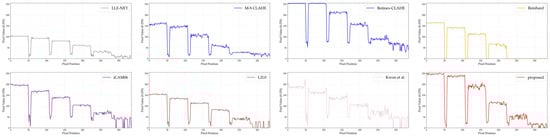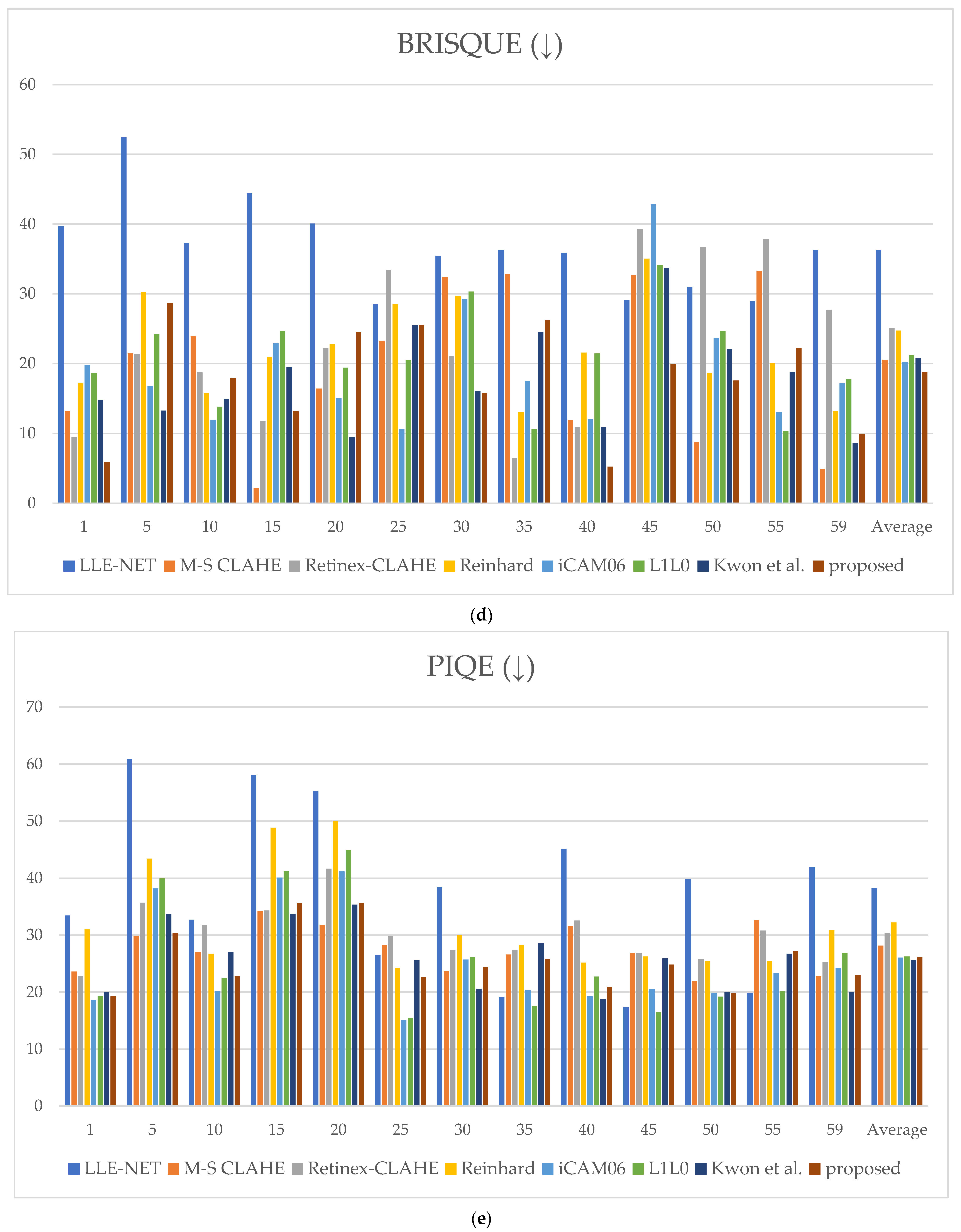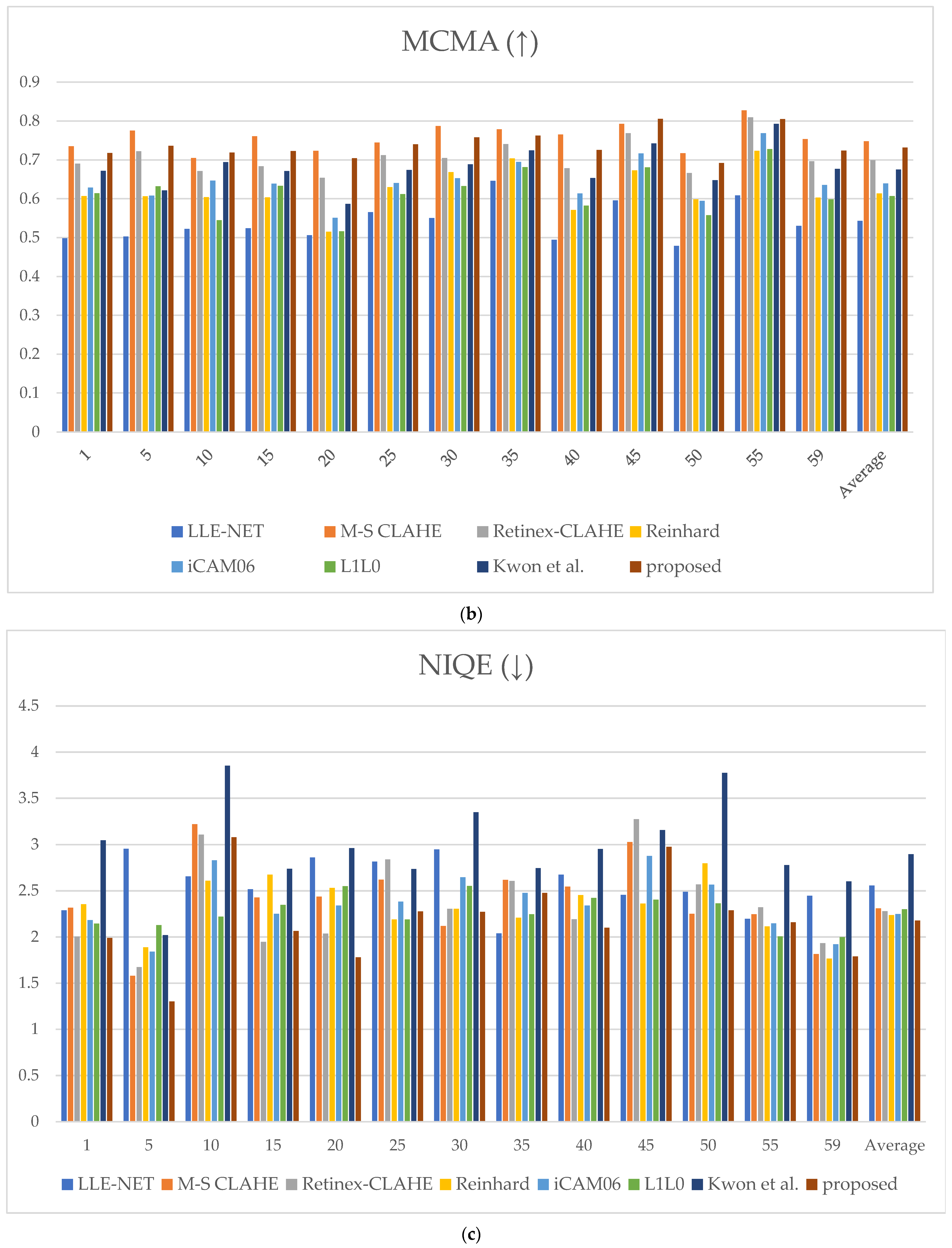 For MCMA, the proposed method achieved an average rank of second place; however, the mean rank across images still belongs to the highest tier, indicating stable and competitive performance in contrast enhancement and artifact suppression. For PIQE, the difference from the top-ranked method was marginal, whereas the gap compared to lower-ranked methods was substantial. This outcome suggests that the proposed method also provides sufficiently stable quality concerning blocking artifacts and noise suppression.