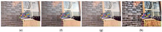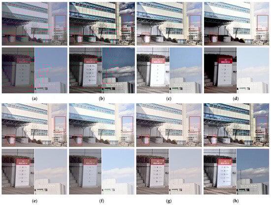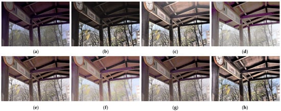 Comparison of detail restoration and luminance balance in an underexposed outdoor scene: (a) LLE-NET, (b) M-S CLAHE, (c) Retinex-CLAHE, (d) Reinhard [], (e) iCAM06, (f) L1L0, (g) Kwon et al. [], and (h) the proposed method.