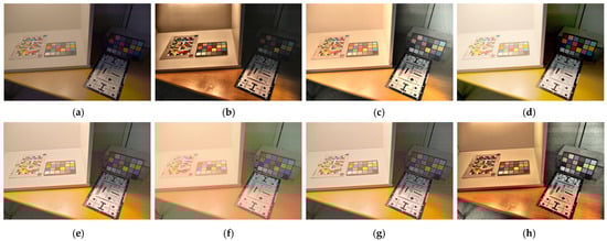 Comparison of chromaticity and structural detail preservation in scenes containing high-luminance regions: (a) LLE-NET, (b) M-S CLAHE, (c) Retinex-CLAHE, (d) Reinhard [], (e) iCAM06, (f) L1L0, (g) Kwon et al. [], and (h) the proposed method.
