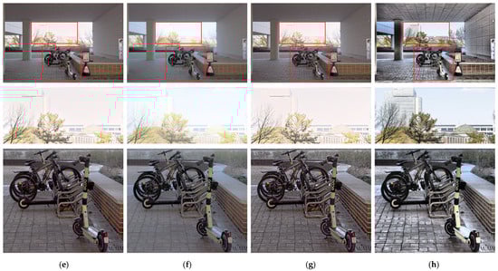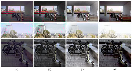 Figure 11, Figure 12 and Figure 13 present an extensive comparative analysis of each method with respect to dark-region restoration, noise suppression, bright-region detail preservation, and saturation control under challenging conditions, including underexposure and complex structural environments. Figure 11 illustrates an underexposed outdoor scene, where the evaluation focuses on the restoration of details in bright background regions (highlighted by red rectangles) and structural objects in dark regions, such as bicycles and scooters, and floor tiles. Figure 11 illustrates an underexposed outdoor scene, where the evaluation focuses on the restoration of details in bright background regions (highlighted by red rectangles) and structural objects in dark regions, such as bicycles and scooters, and floor tiles. In the original image, most structural details in the shadowed areas are indistinguishable due to overall underexposure, and the boundaries between the sky and buildings in bright regions are also unclear.