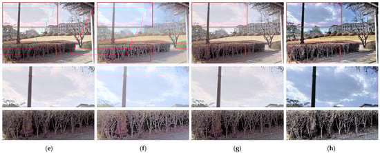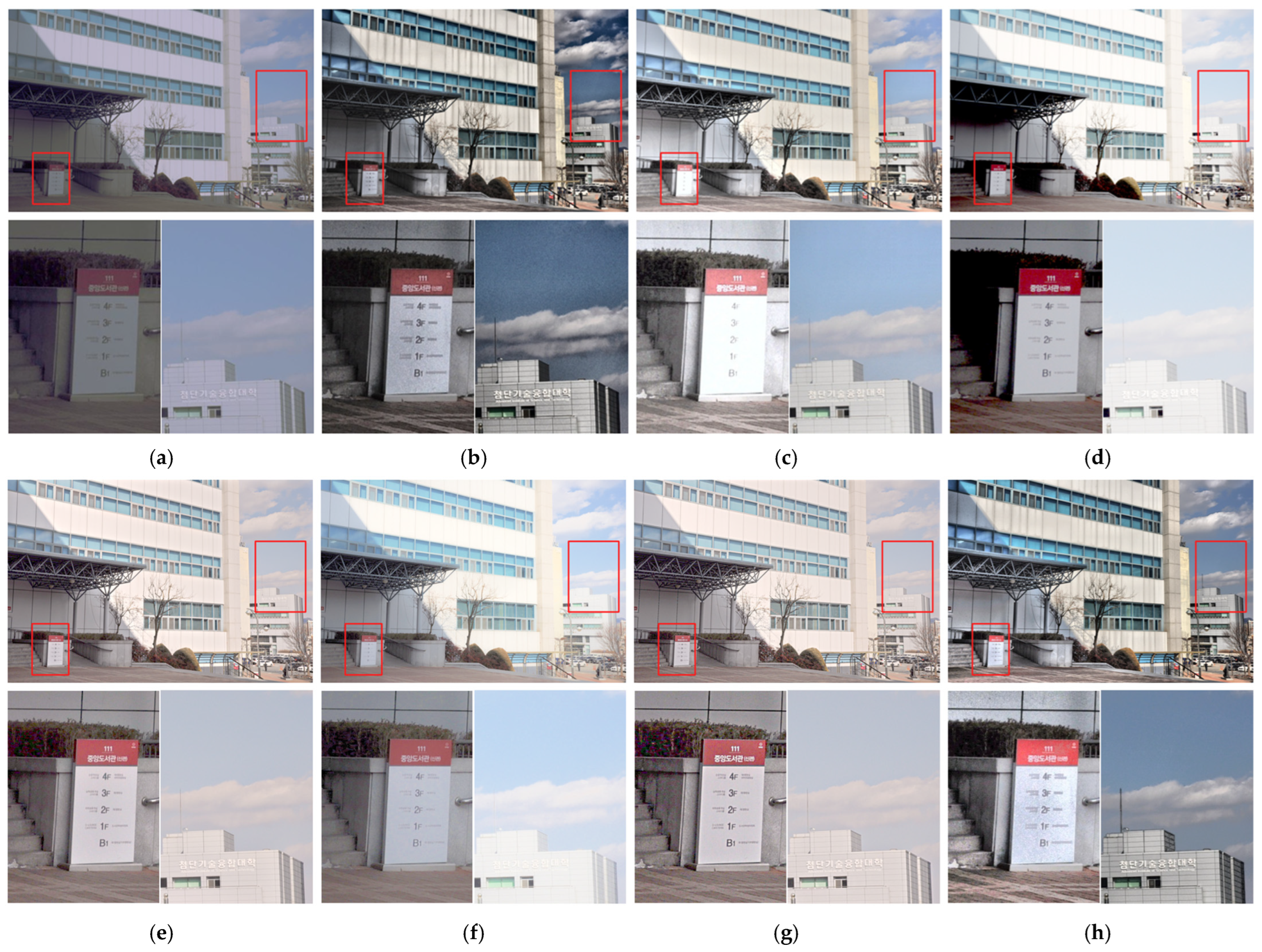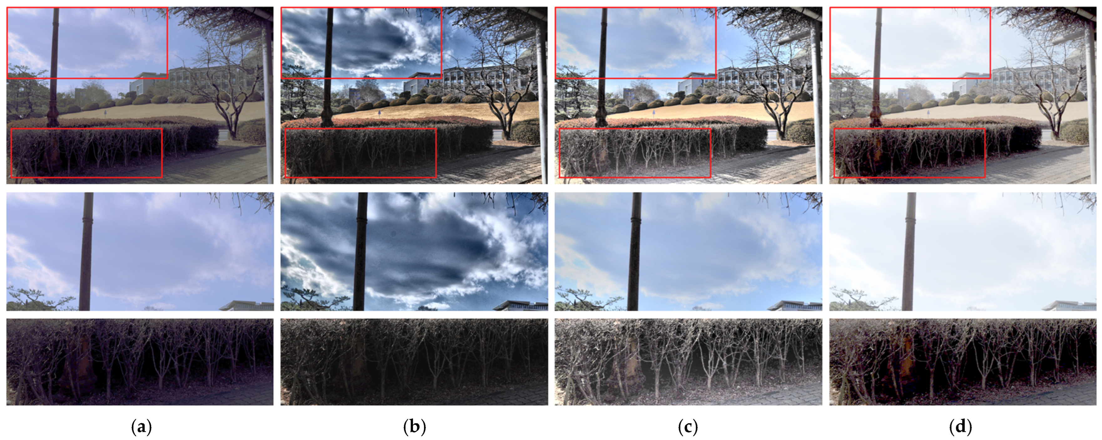Figure 12 compares the preservation of chromaticity and structural details in scenes with high-luminance regions, such as direct sunlight and open sky. The red rectangles indicate the magnified regions used for evaluating the preservation of fine details and tonal continuity in both bright and dark areas. This analysis emphasizes the effectiveness of retaining tonal continuity and fine details while avoiding luminance degradation in bright regions under mixed illumination. Magnifying the sky and dark regions marked by red rectangles allows for a clearer assessment of the characteristic behaviors of each method. The original image, captured under a strong backlight, reveals silhouetted foreground structures, with most of the details nearly unrecognizable.