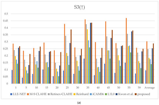 Together, these five metrics offer a complementary and multifaceted framework for evaluating image enhancement performance. Although S3 and MCMA emphasize structural fidelity and contrast handling, NIQE, BRISQUE, and PIQE capture perceptual naturalness and artifact suppression. This comprehensive evaluation ensures that the proposed method is assessed in terms of local contrast and sharpness and its ability to preserve the natural visual appearance without introducing undesirable distortion. The bar charts in Figure 14 present the quantitative scores of each method for all five metrics, along with their average values.