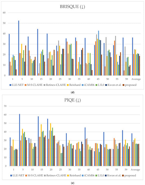 The NIQE method is a completely blind quality assessment method that measures perceptual naturalness by quantifying deviations from the statistical regularities of the natural images []. Unlike full-reference metrics, this method does not require a pristine reference image, and lower NIQE values indicate that an enhanced image remains closer to the natural scene distribution. The BRISQUE method also operates in a no-reference setting, evaluating the degradation of naturalness via locally normalized luminance coefficients []. Again, lower values signify that distortions, such as noise or unnatural contrast, are less pronounced. Finally, PIQE estimates blockwise distortions, including compression artifacts and Gaussian noise, producing a spatial quality mask that derives an overall perceptual quality score []. A smaller PIQE score implies better visual quality with reduced blockiness and noise.