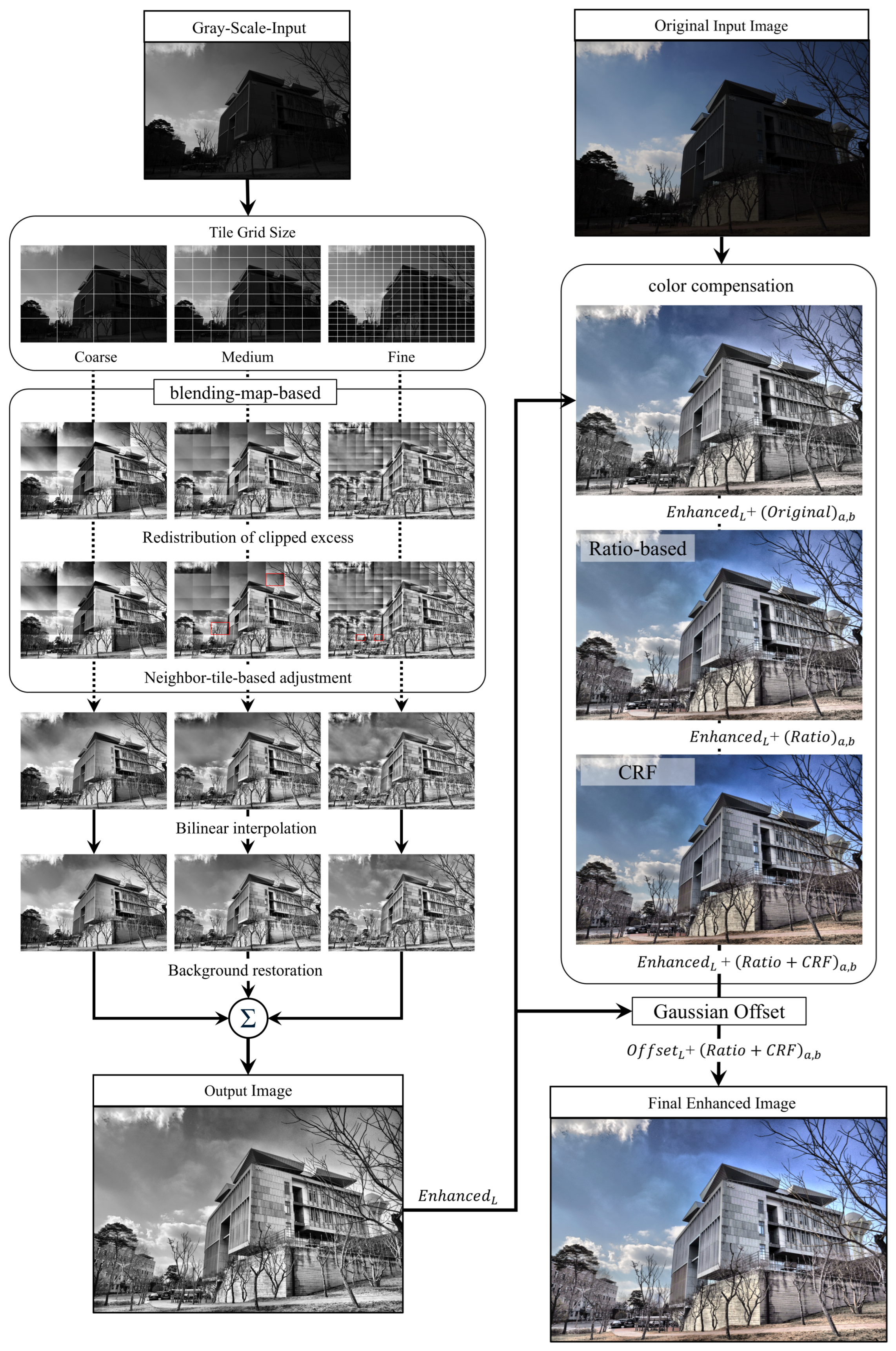 Figure 1, the red box indicates the region where this neighbor-tile-based adjustment was applied to correct local luminance discontinuities across tile boundaries. Pixel-level bilinear interpolation is applied to construct continuous LUTs, suppressing blocking artifacts and ensuring tonal continuity across tile boundaries. A background restoration stage corrects regions distorted by excessive local contrast enhancement, referencing the original image to maintain a natural appearance. The results from the three scales are integrated using average fusion (Σ), where fine-scale partitions emphasize local structures and coarse-scale partitions suppress block artifacts, balancing detail preservation and structural smoothness.