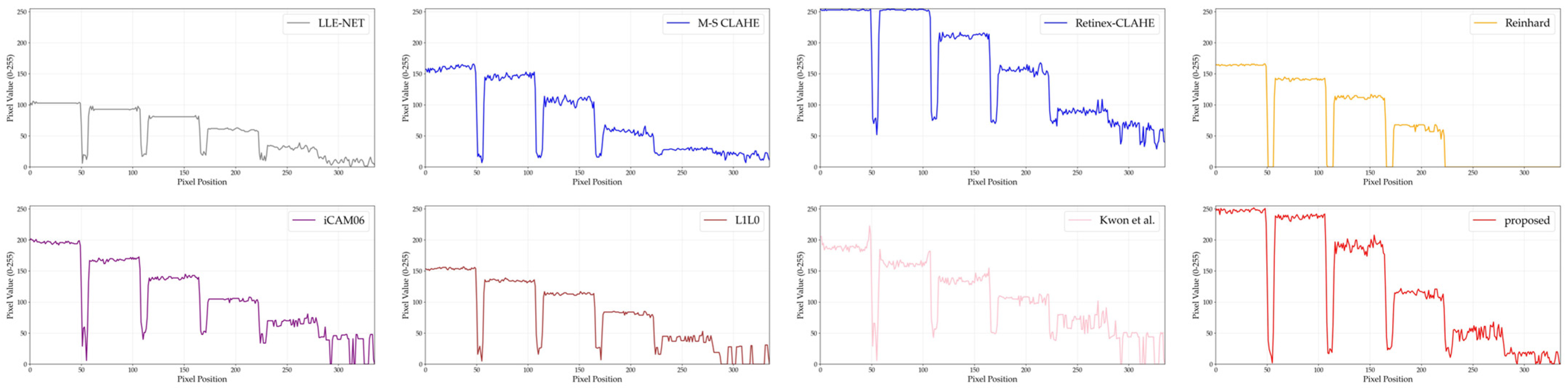 Table 1 summarizes the quantitative results in terms of average ± standard deviation for each metric. The proposed method not only achieved consistently favorable average scores but also exhibited relatively small deviations, indicating stable performance across diverse images. In contrast, although MS-CLAHE recorded competitive average scores, it showed large deviations, implying unstable behavior depending on image content. Consequently, when ranking individual images across metrics, the proposed method was superior in most cases, demonstrating both robustness and reliability in performance.