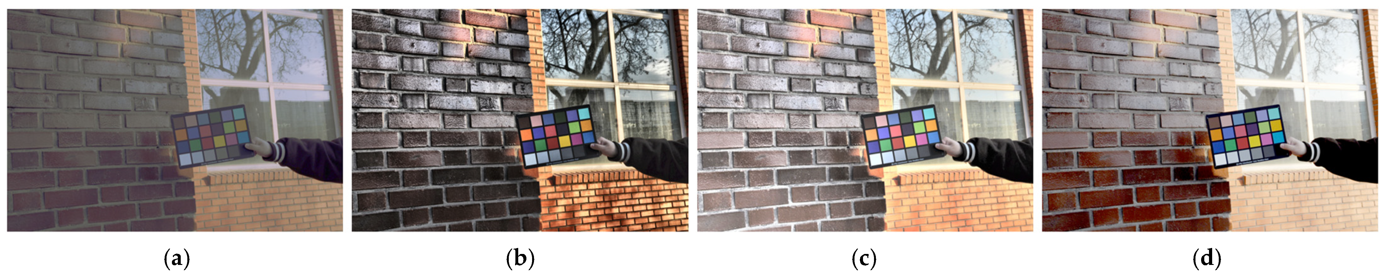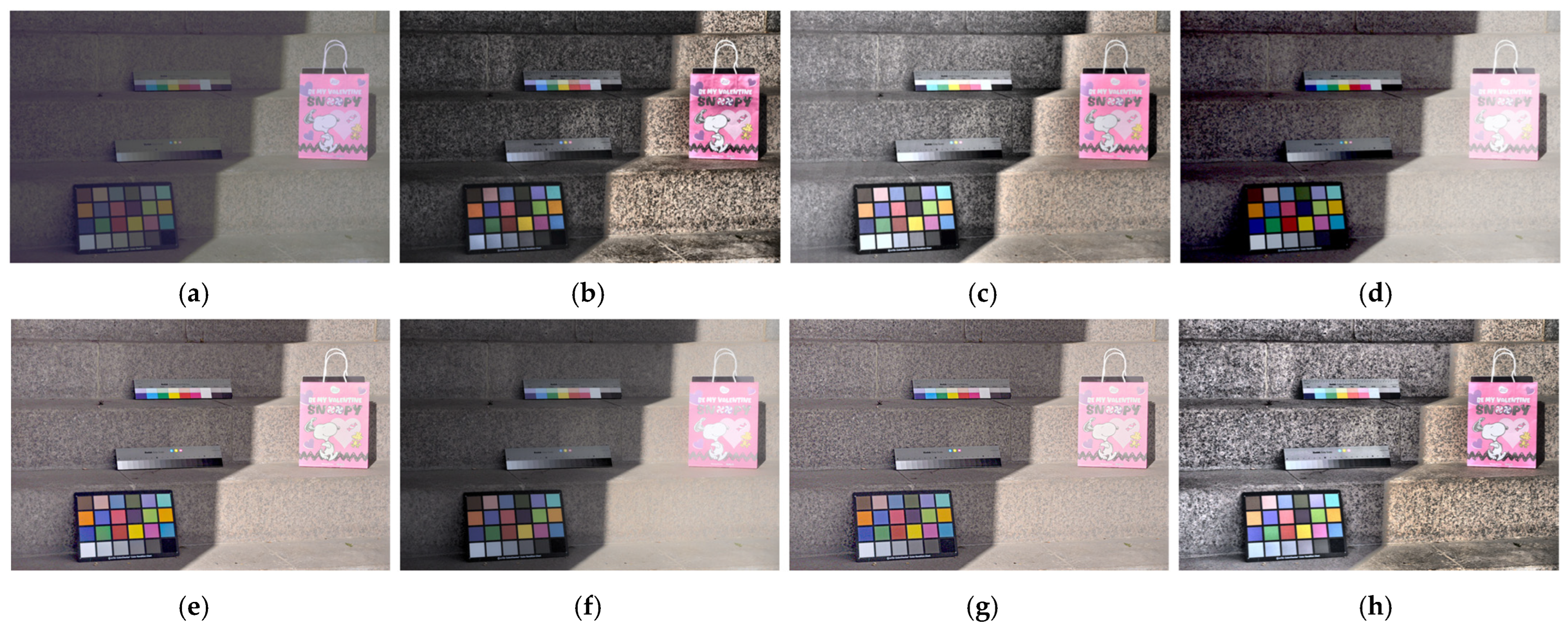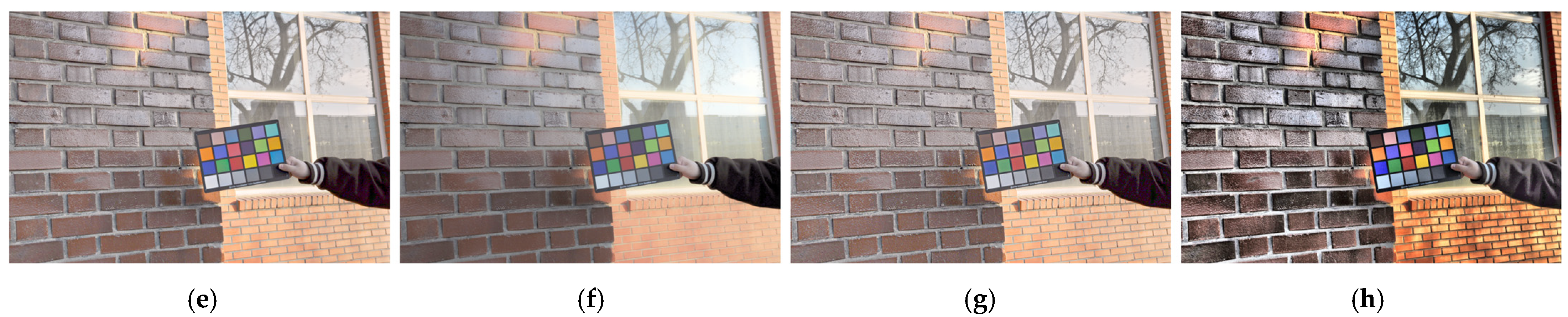 Figure 5 presents the results of global tone mapping and local detail restoration using a color chart placed in an outdoor environment. The experiment was conducted under mixed illumination, where high- and low-luminance regions coexist, to evaluate the structural preservation and color fidelity across contrast ranges.
