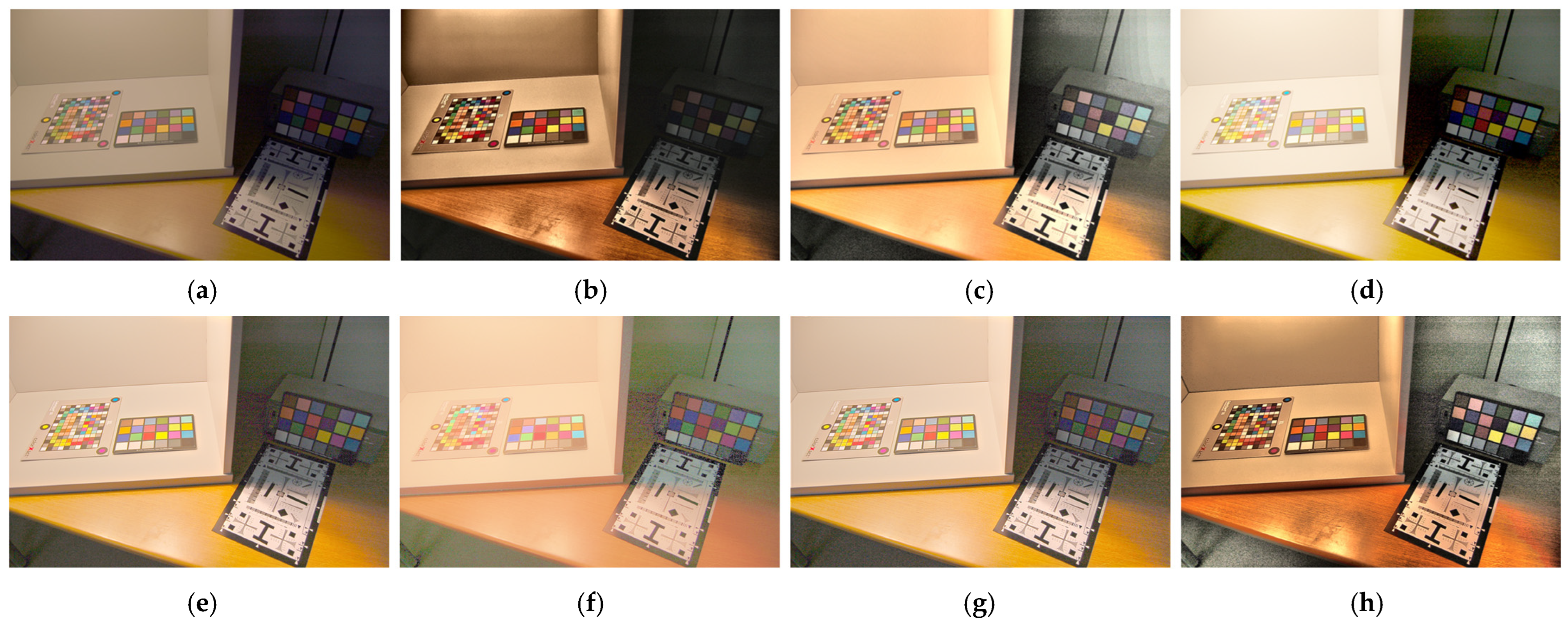 In contrast, the proposed method demonstrated consistently superior color rendering. Across the illumination conditions, color distortions induced by luminance correction were suppressed, and primary colors were faithfully reproduced across the full tonal range (