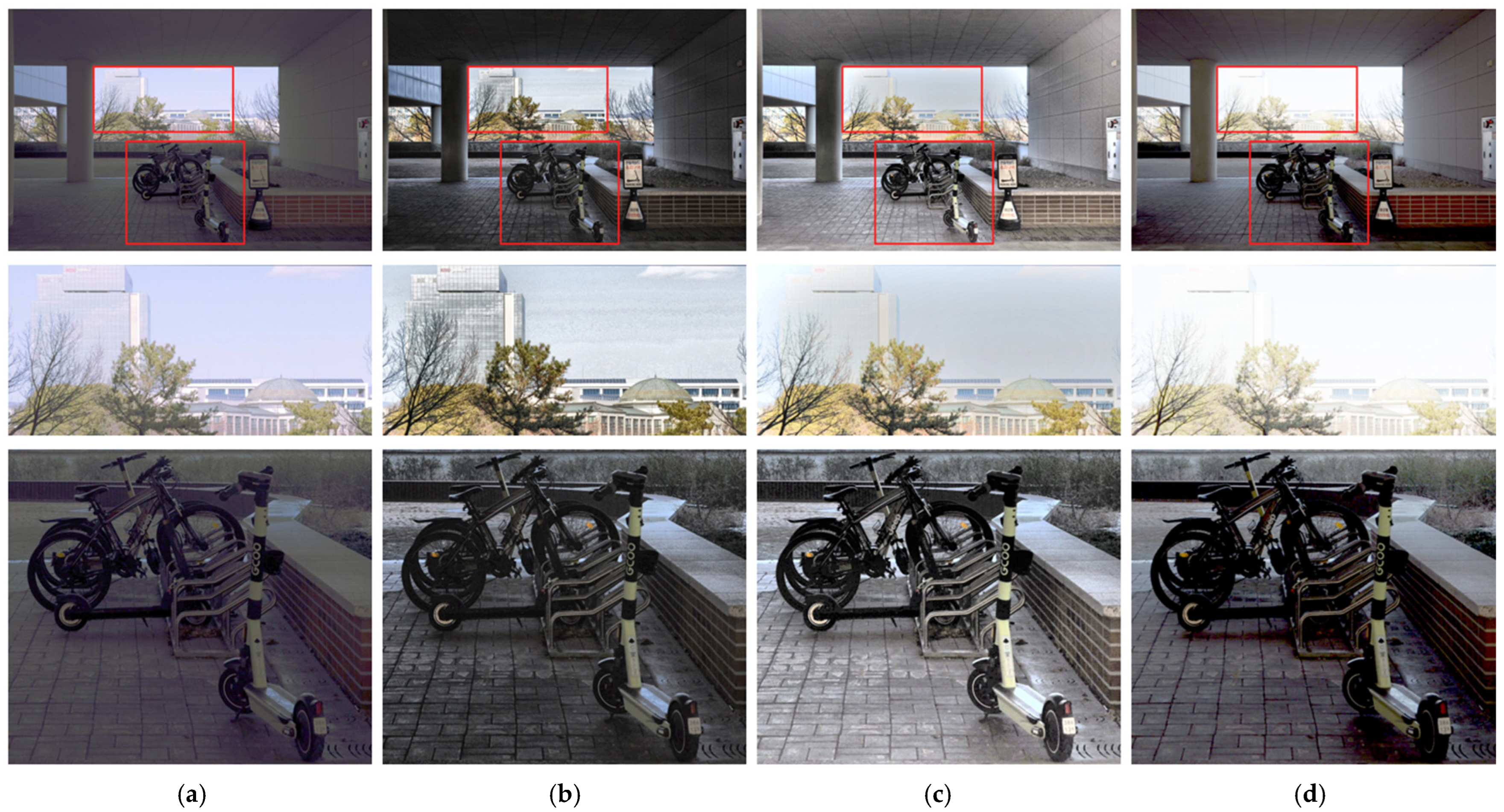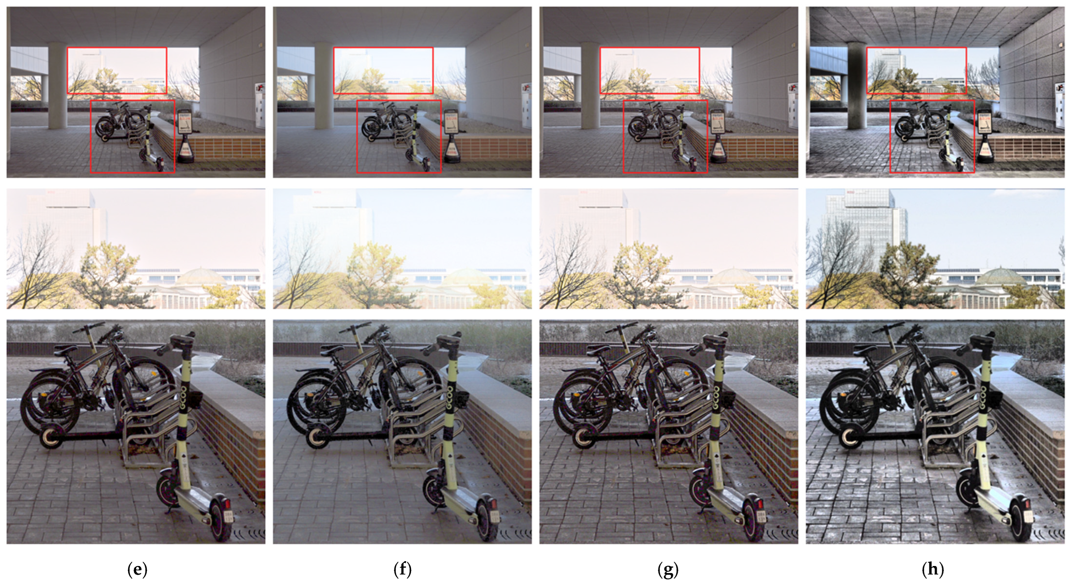 Figure 11 illustrates an underexposed outdoor scene, where the evaluation focuses on the restoration of details in bright background regions (highlighted by red rectangles) and structural objects in dark regions, such as bicycles and scooters, and floor tiles. In the original image, most structural details in the shadowed areas are indistinguishable due to overall underexposure, and the boundaries between the sky and buildings in bright regions are also unclear.