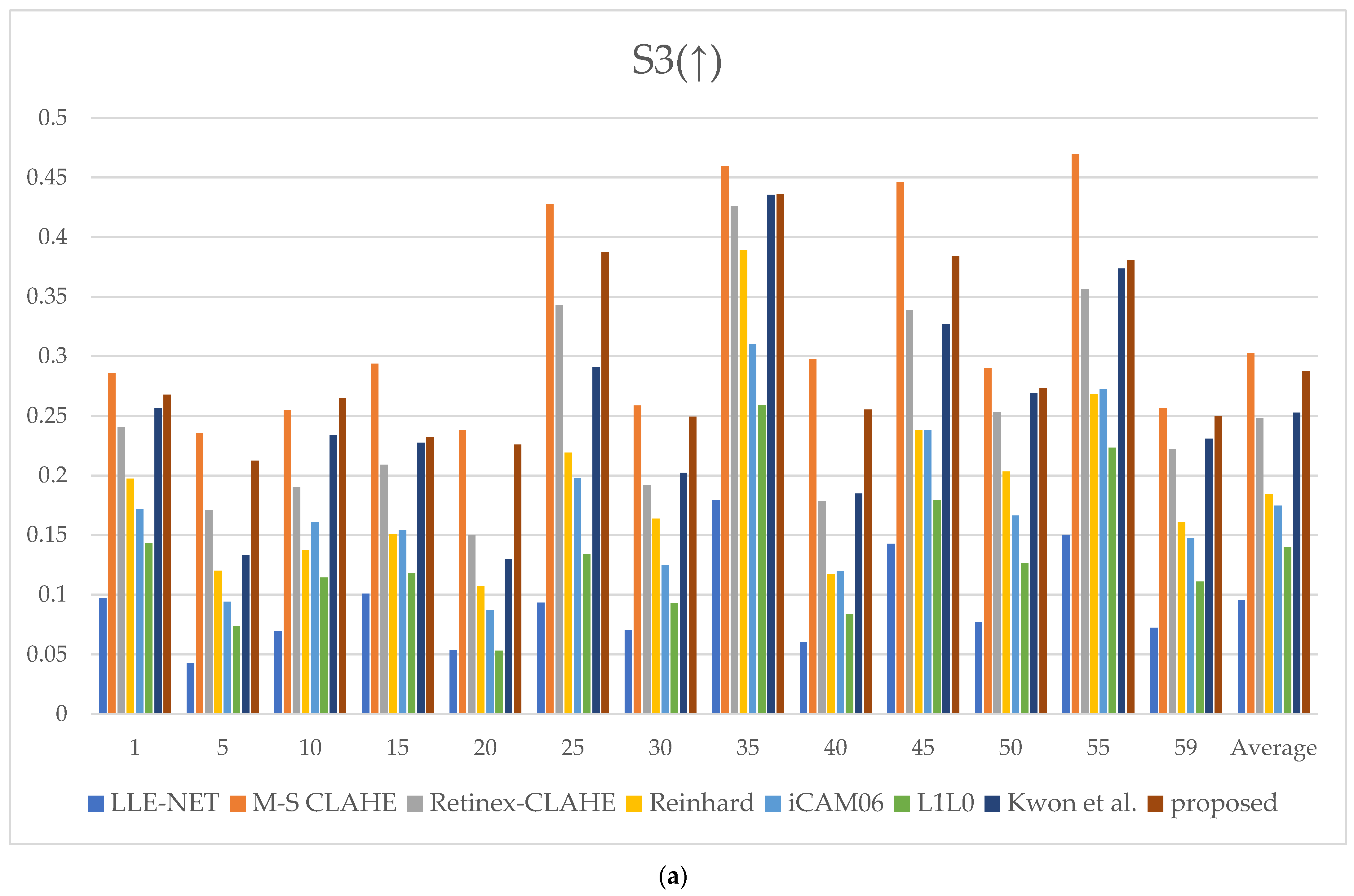 Together, these five metrics offer a complementary and multifaceted framework for evaluating image enhancement performance. Although S3 and MCMA emphasize structural fidelity and contrast handling, NIQE, BRISQUE, and PIQE capture perceptual naturalness and artifact suppression. This comprehensive evaluation ensures that the proposed method is assessed in terms of local contrast and sharpness and its ability to preserve the natural visual appearance without introducing undesirable distortion. The bar charts in