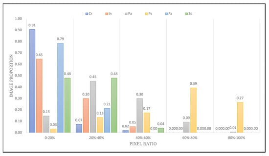 Defect pixel proportion in NEU-DET dataset. Cr, In, and Rs defects mostly occupy under 20% of image pixels, rarely exceeding 40%. Sc defects are predominantly below 40%, with few between 40–60%. Pa defects are mainly within 60%, with 9% between 60–80%. Over half of Ps defects cover more than 60% of image pixels.