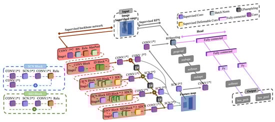 Our proposed SFF-Net model is based on the Faster R-CNN architecture. As shown in Figure 2, SFF-Net consists of three key components: a backbone based on Residual Network (ResNet50) [38] and Feature Pyramid Network (FPN) [39], an RPN, and a head. During the training phase, the backbone incorporates Supervised Convolution (SCN), enabling the model to naturally focus on local features within supervised ranges, reducing computational cost on redundant background areas and improving training efficiency. Additionally, Supervised Deformable Convolution (SDCN) is introduced to ResNet50. By implementing dynamic sampling within supervised ranges, SDCN enhances the model’s global feature extraction capability for complex defect shapes. In the RPN, our proposed Supervised Region Proposal Strategy (SRPS) utilizes supervised ranges to directly guide sample allocation for candidate regions, improving both the quality and efficiency of region proposals. These supervised operations are implemented based on constructed supervision regions, achieving precise focus in feature extraction and region proposal, enhancing the model’s training efficiency and detection performance.
