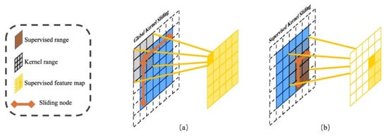 where is the current convolution center position. If falls within the supervised range , then convolution is performed. Otherwise, this position is skipped, and the process continues to evaluate the next position. The core concept of supervised convolution lies in restricting convolution operations within the supervised range , skipping redundant computations in background regions to optimize computational efficiency and feature extraction capability. Compared to traditional convolution that traverses the entire feature map point by point, SCN more efficiently focuses on target region features by incorporating task-specific supervised range designs. For a clearer illustration of the SCN’s operational mechanism, the computational process defined in Equation (9) is detailed as pseudocode in Algorithm 3.