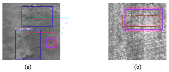 First, for small-sized defects, consecutive downsampling operations excessively weaken their features on deeper feature maps, ultimately resulting in missed detections. For instance, As shown in Figure 10a, the isolated defects located far from the defect clusters are difficult for the model to distinguish from the background due to their small size and blurred boundaries, resulting in missed detections. Observing the sizes of defects in the failure cases, their long axis is often less than 10 pixels, a characteristic that is easily overlooked by detection networks. Second, for low-contrast defects, their boundary features are inherently weak and are further diluted during the convolution and downsampling processes, making it challenging for the model to extract sufficient discriminative features, which results in localization errors or missed detections. As shown in Figure 10b, these defects are difficult for the model to accurately identify due to their extremely low contrast with the background.