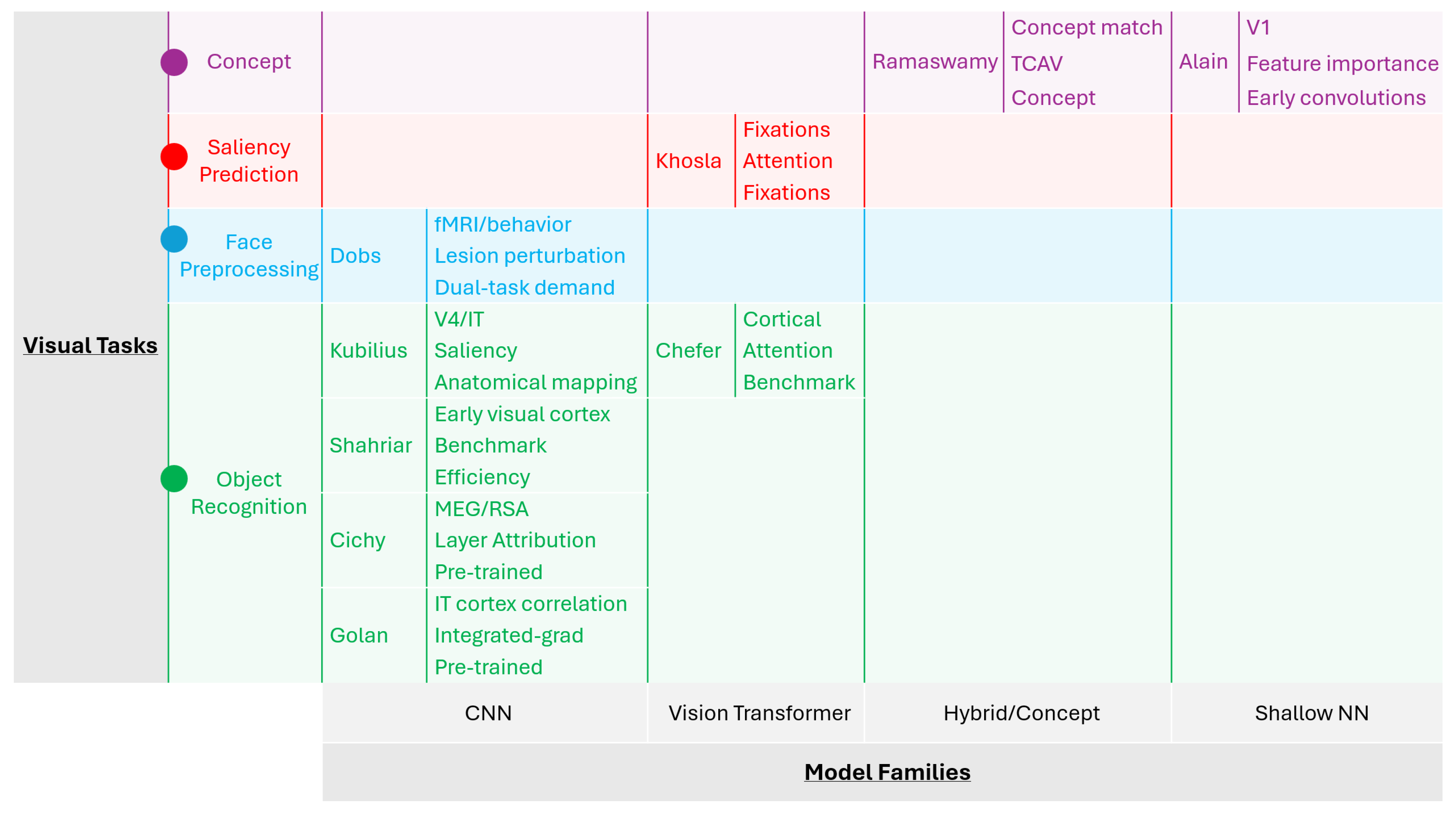 Golan [116] | CNN (VGG-16) | Visualcategorization | Integratedgradients | Feature importance maps show overlap with IT cortex response patterns. |