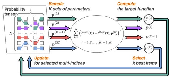 - Sampling. At each iteration, K random sets of parameters for l = 1, 2, …, K are sampled from the tensor p with a probability proportional to its corresponding values. Note that at the first iteration this will correspond to sampling from a random distribution, and at subsequent iterations the adjusted distribution function will be taken into account. Due to the use of the TT-format, sampling is carried out efficiently with linear complexity in terms of dimensionality.