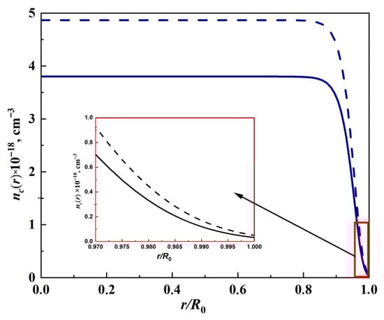 Radial dependence of the conduction electron density nc(r). Solid curve corresponds to T = 693 K, dashed curve to T = 793 K. The nanoparticle radius R0 is equal to 37 nm.