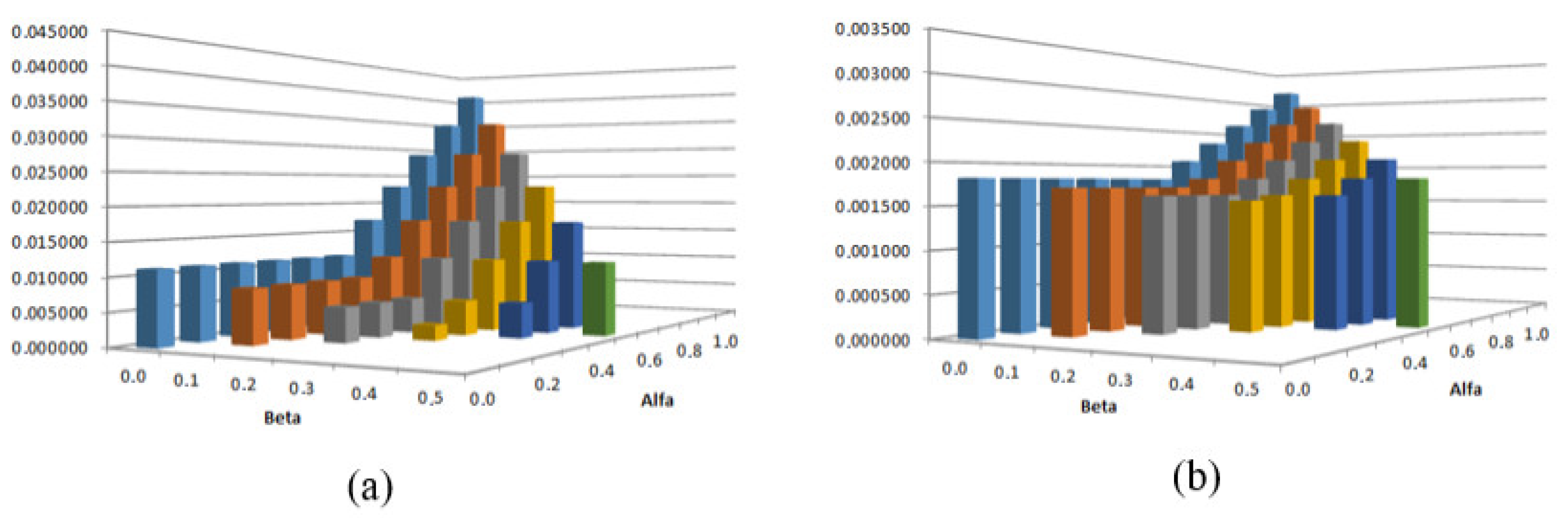 The definition of the membership and non-membership functions ( and ), together with their increasing or decreasing structure, determines the relative influence of and on the solutions. Numerical experiments show that variations in α have a stronger effect on the results compared to . This behavior can be attributed to two structural aspects of the model. First, since the IF constraint set includes and , the feasible range of is generally narrower than that of α, reducing the likelihood that becomes binding. Second, the piecewise-linear membership and non-membership functions place critical decision thresholds primarily on the membership () side, meaning that increasing tightens the acceptable lower bound of expected returns, while the non-membership threshold often remains non-binding for the considered datasets.