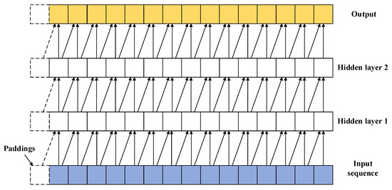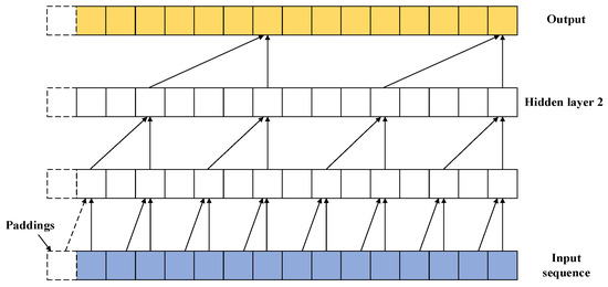 where the refers to one-dimension fully convolution network; Causal Conv refers to causal convolution, that is, the value of the current time step in the convolutional layer depends only on the values at the current time step and earlier in the previous layer. It ensures no leakage of future information in the sequence. Dilated Conv refers to dilated convolution, where holes are introduced in the convolutional kernel to address the issue of increased computation in causal convolution when dealing with variable-length sequences, and it also increases the receptive field. The process of causal convolution and dilated convolution is represented in Figure 2 and Figure 3.